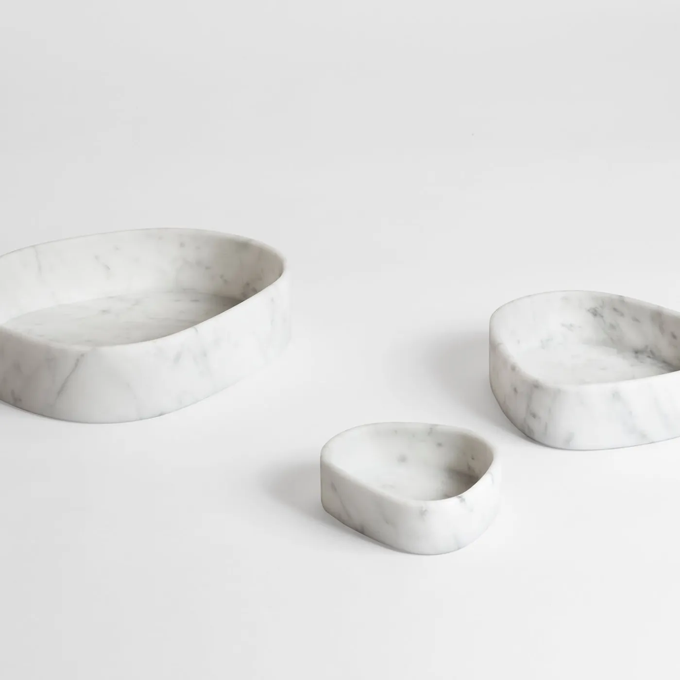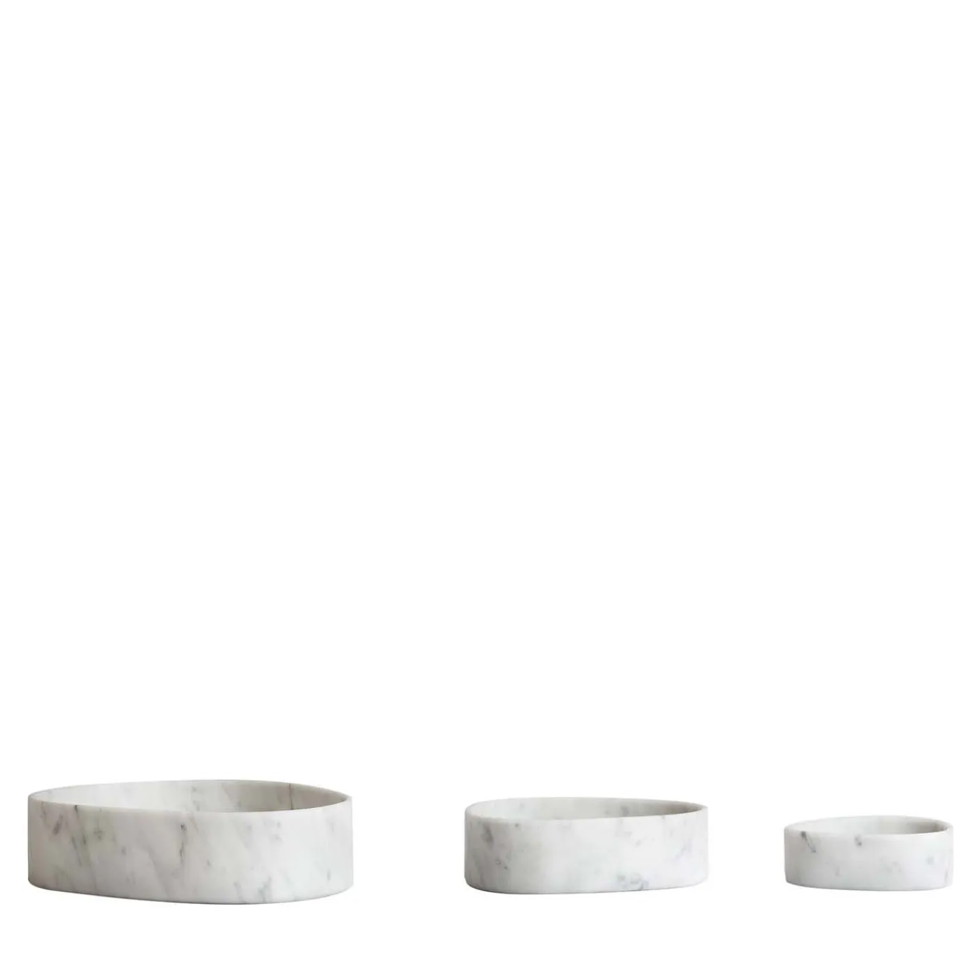 Questo elegante set di tre ciotole uniche di forma irregolare (12 x 11 x H4 cm, 17 x 16 x H5 cm e 24 x 20 x H6 cm) è realizzato in marmo bianco di Carrara per rivelare oggetti di uso quotidiano di alta qualità che è un piacere utilizzare. Queste ciotole funzionali e affascinanti sono disponibili anche in pietra lavica, per i cui dettagli si prega di consultare il Concierge.