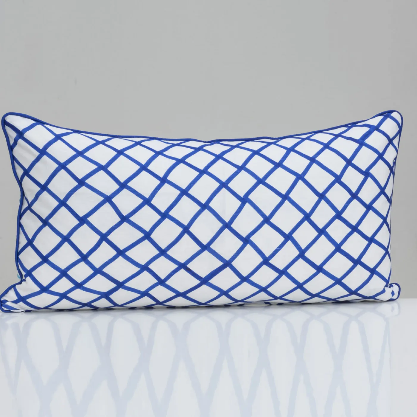 Questo cuscino di grande effetto ha un inserto in piuma d’oca e una copertura in lino decorata con un pesce bicolore blu e bianco su una rete turchese che corre per metà del fronte della copertura e sul retro. Anche il bordo del cuscino è elegantemente dipinto in blu scuro.