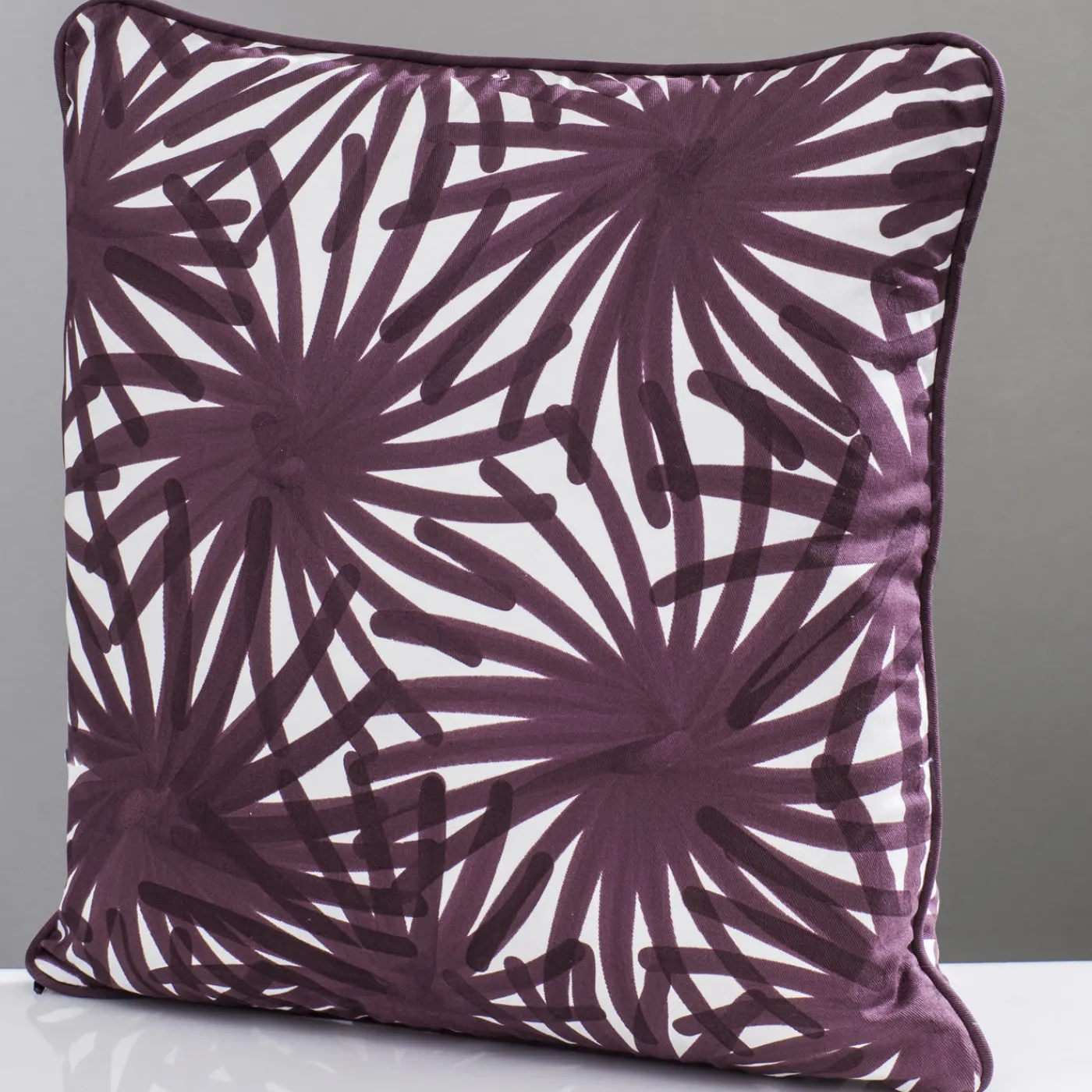 Questo cuscino di grande effetto ha un inserto in piuma d’oca e una fodera in 100% cotone decorata con la tecnica della stampa a pigmenti con un motivo di fuochi d’artificio marroni su sfondo bianco.