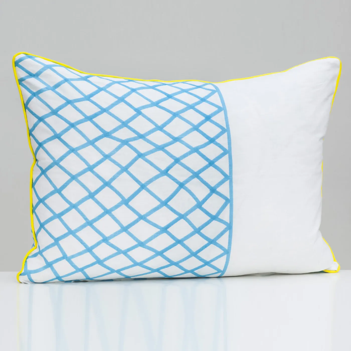 Questo raffinato cuscino ha un inserto in piuma d’oca con una copertina in lino decorata con un pesce bicolore blu e bianco e un pesce giallo e blu con suggestivi motivi geometrici su una rete turchese che corre per metà del fronte della copertina e sul retro. Anche il bordo del cuscino è dipinto in giallo vivo.