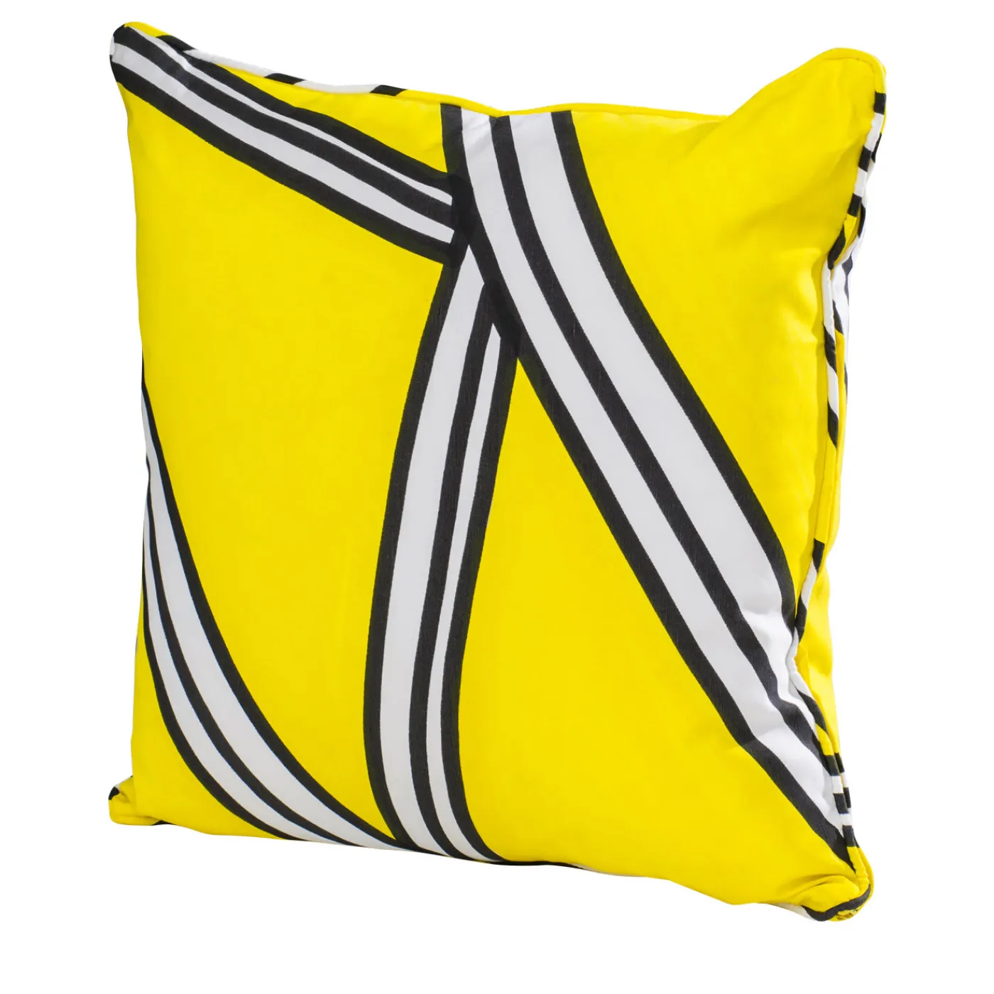 Questo elegante cuscino è dotato di un inserto in piuma d’oca e di una fodera in cotone 100% decorata con la tecnica della stampa a pigmenti con un sorprendente motivo geometrico di linee parallele e perpendicolari bianche e nere su un vivace sfondo giallo limone.