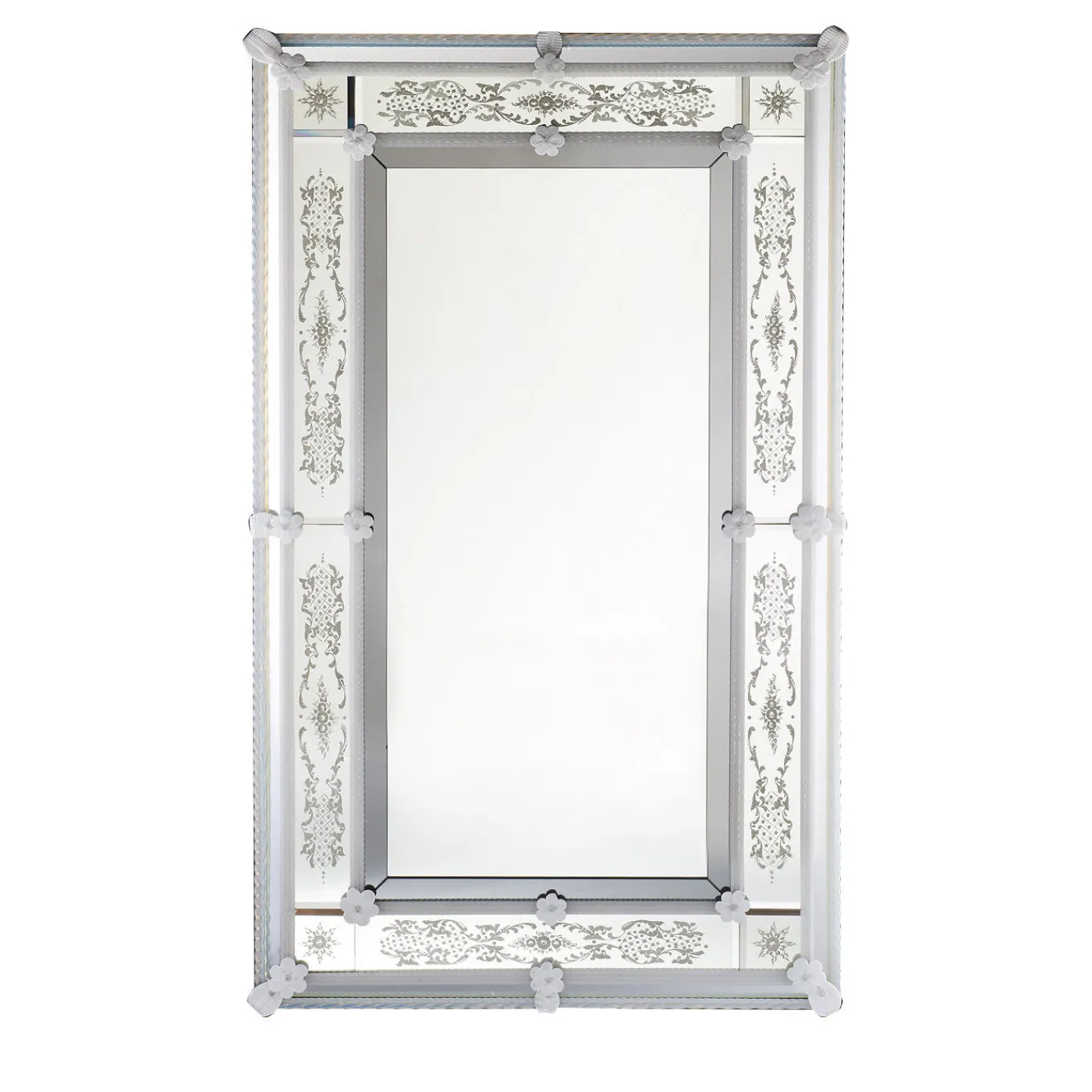 Semplice eleganza tradizionale. Lo specchio da parete Calle Madonia è uno stile tranquillo e regale per ogni casa. Lo specchio rettangolare è incorniciato da una cornice in legno dipinto e arricchito da incisioni in argento e fiori in vetro satinato. Lo specchio può essere personalizzato sia nel colore che nella forma per adattarsi al meglio al vostro spazio.