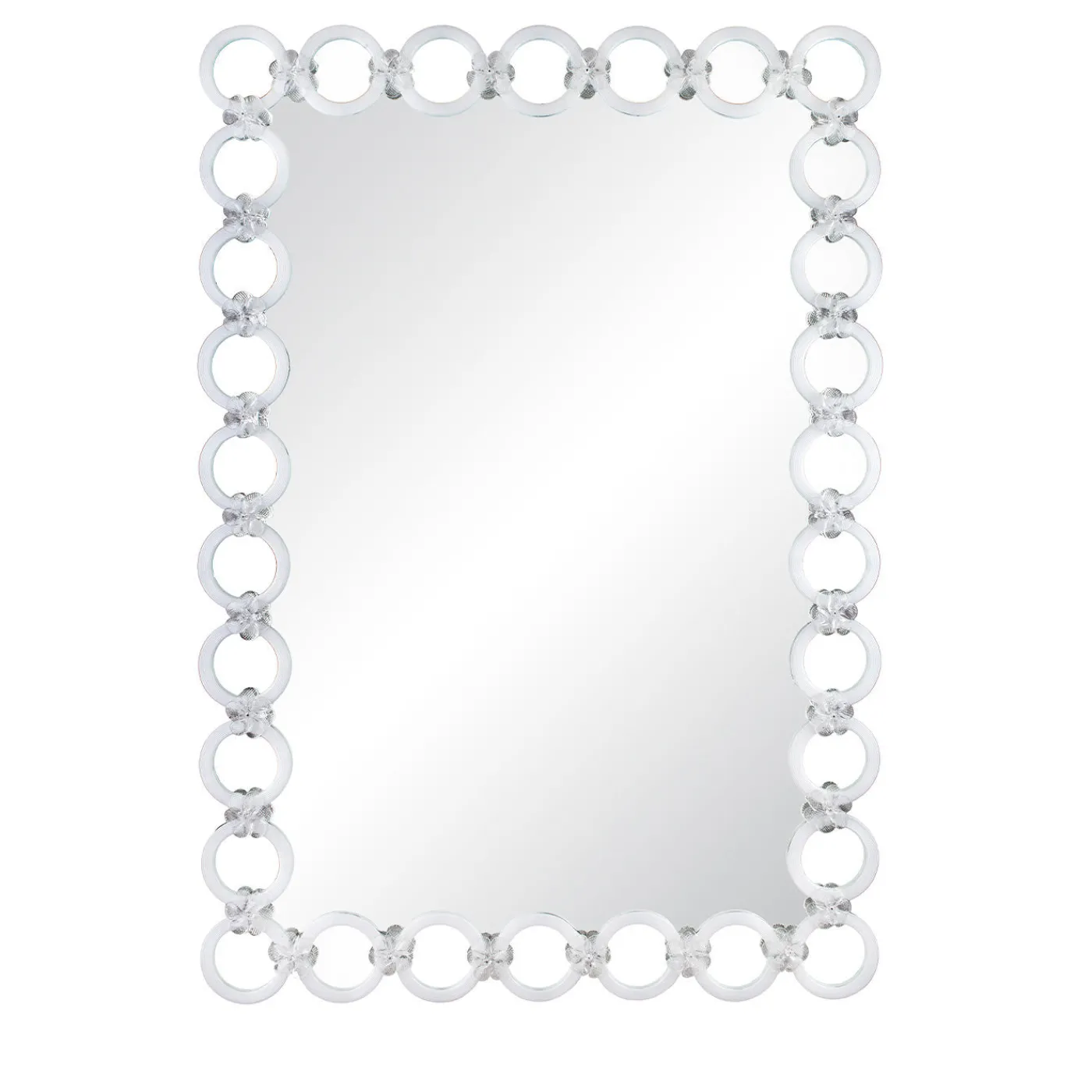 Completamente personalizzabile nelle dimensioni e nei colori, lo specchio da parete Calle Rotonde è uno stile originale per qualsiasi spazio e arredamento. Lo specchio rettangolare è appoggiato su un supporto di legno e incorniciato da anelli di vetro che formano un effetto a catena unico. Scegliete colori neutri per un look tradizionale o tonalità vivaci per un tocco contemporaneo.