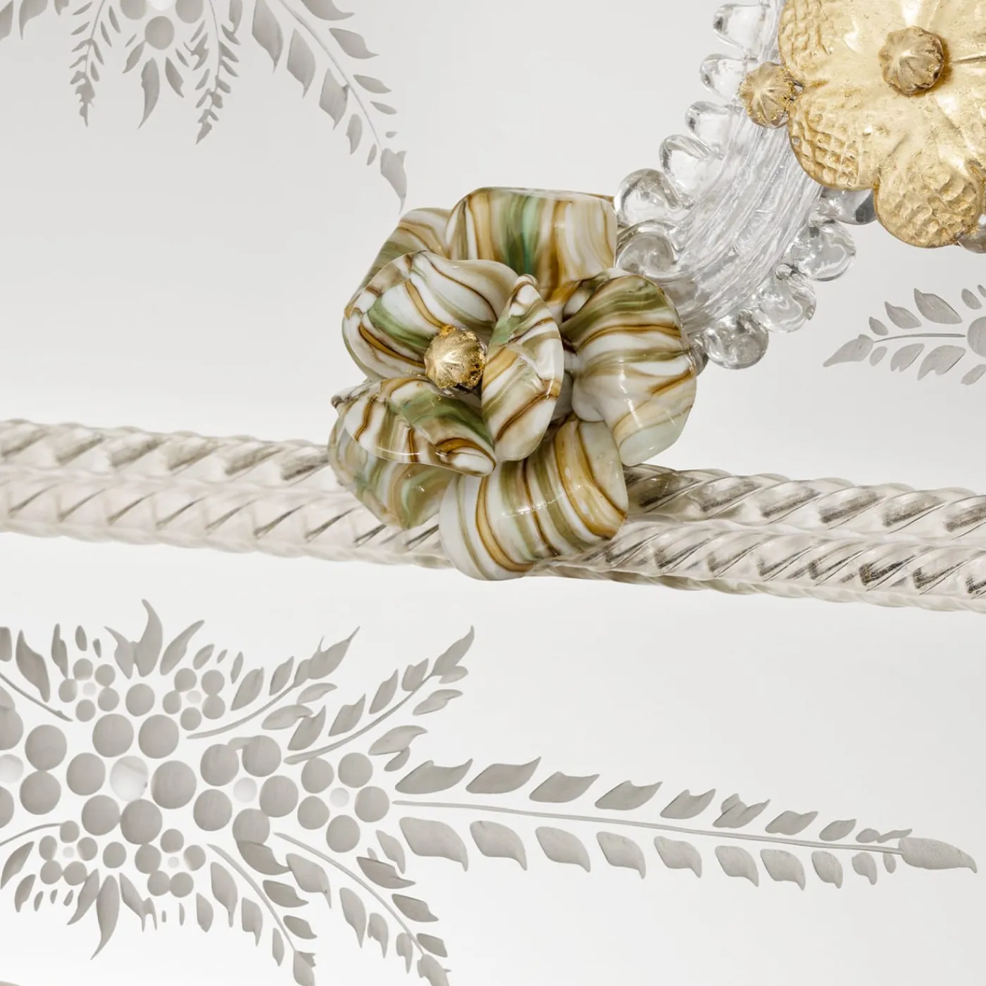 Opulenza e romanticismo si fondono in questo superbo specchio. Uno spettacolo sia per gli arredamenti contemporanei che per quelli classici, vanta graziose incisioni floreali eseguite a mano da maestri artigiani e ornate da rose dorate, fiori policromi e foglie in una lussuosa combinazione di onice e oro.