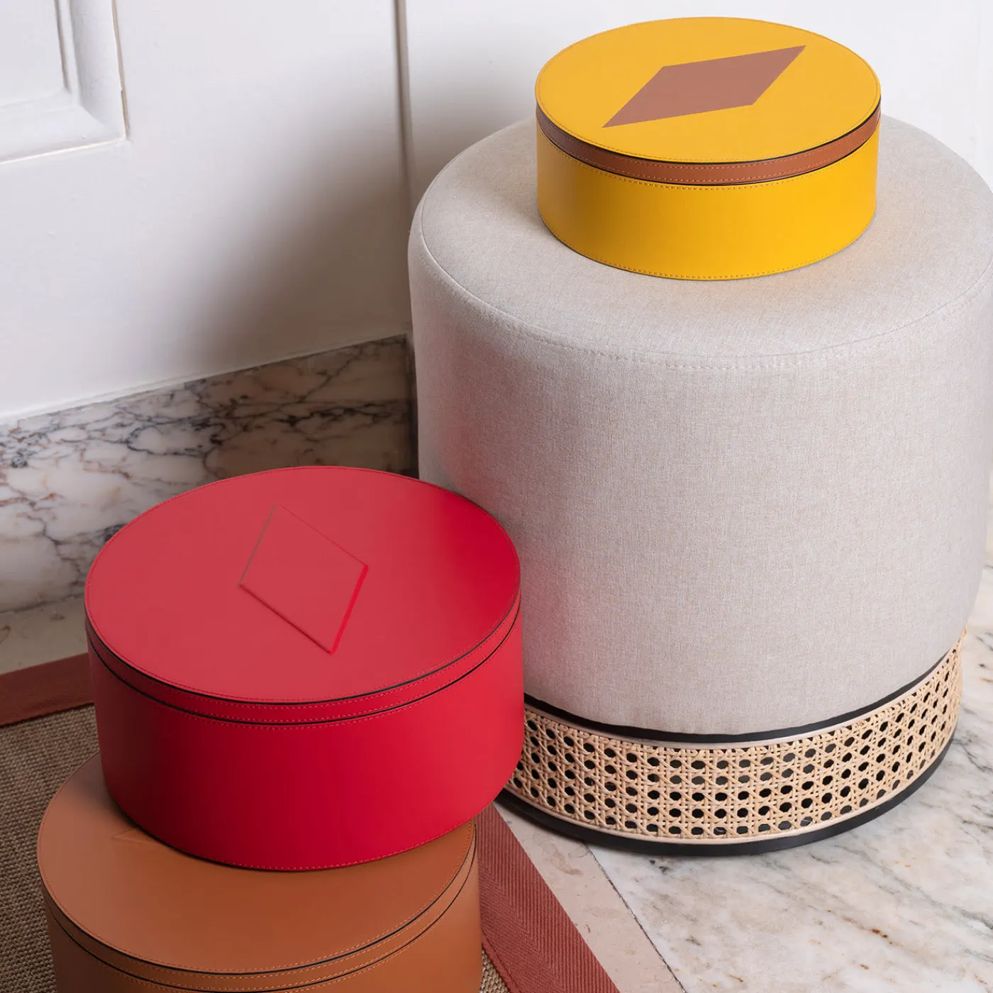 Scatola interamente rivestita in pelle con motivo geometrico in rilievo, leitmotiv di Luhdo. Un oggetto per sé o un regalo esclusivo in cui riporre i propri oggetti o come complemento d’arredo.