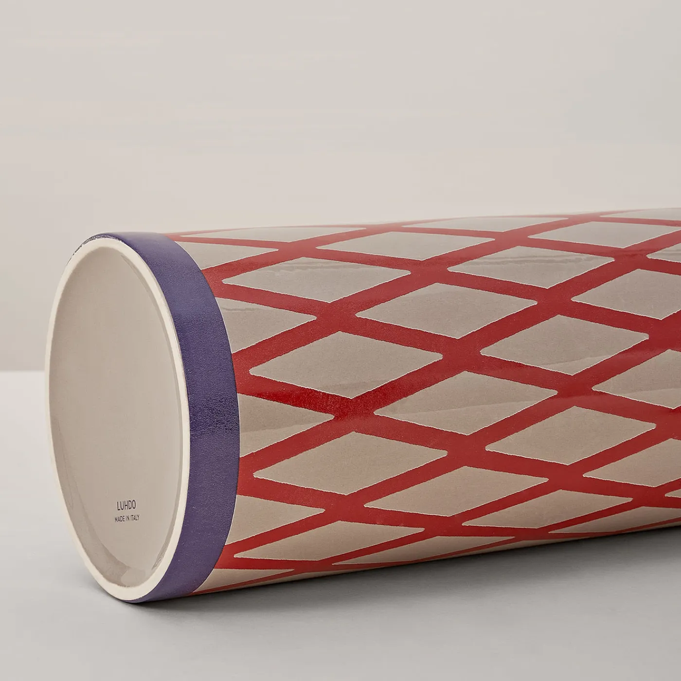 Vaso cilindrico ispirato alla stampa Marquise Carrè. Un complemento d’arredo in cui geometria e colore si fondono per creare un oggetto esclusivo.