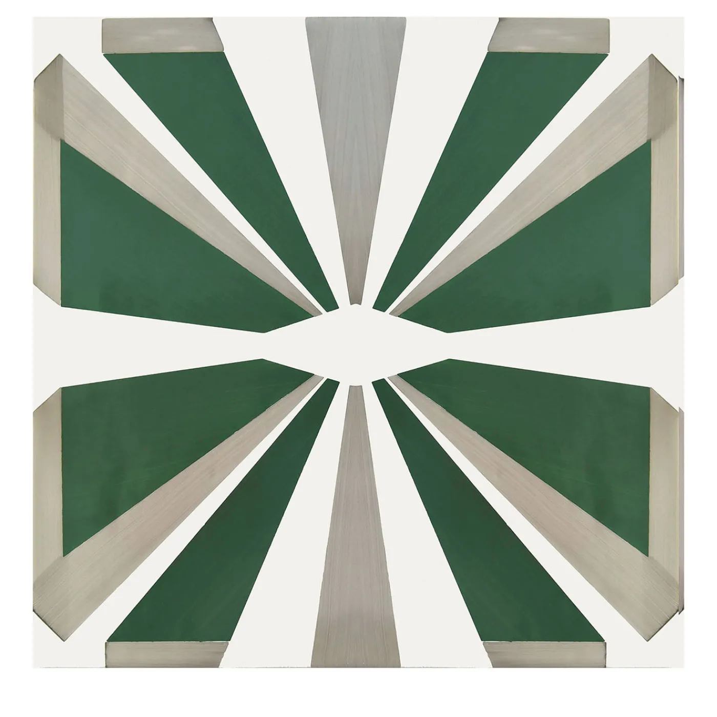Set di 4 piastrelle della collezione Bauhaus 50 disegnata da Giuseppe Oliva, caratterizzata da un motivo geometrico che riprende le linee razionali della scuola tedesca Bauhaus. Questo formato aggiornato 50×50 cm comprende nuove forme e una variante verde militare brillante, che amplia la palette originale di blu e tortora. Ideale per aggiungere elementi strutturati e artistici alle superfici interne della casa.