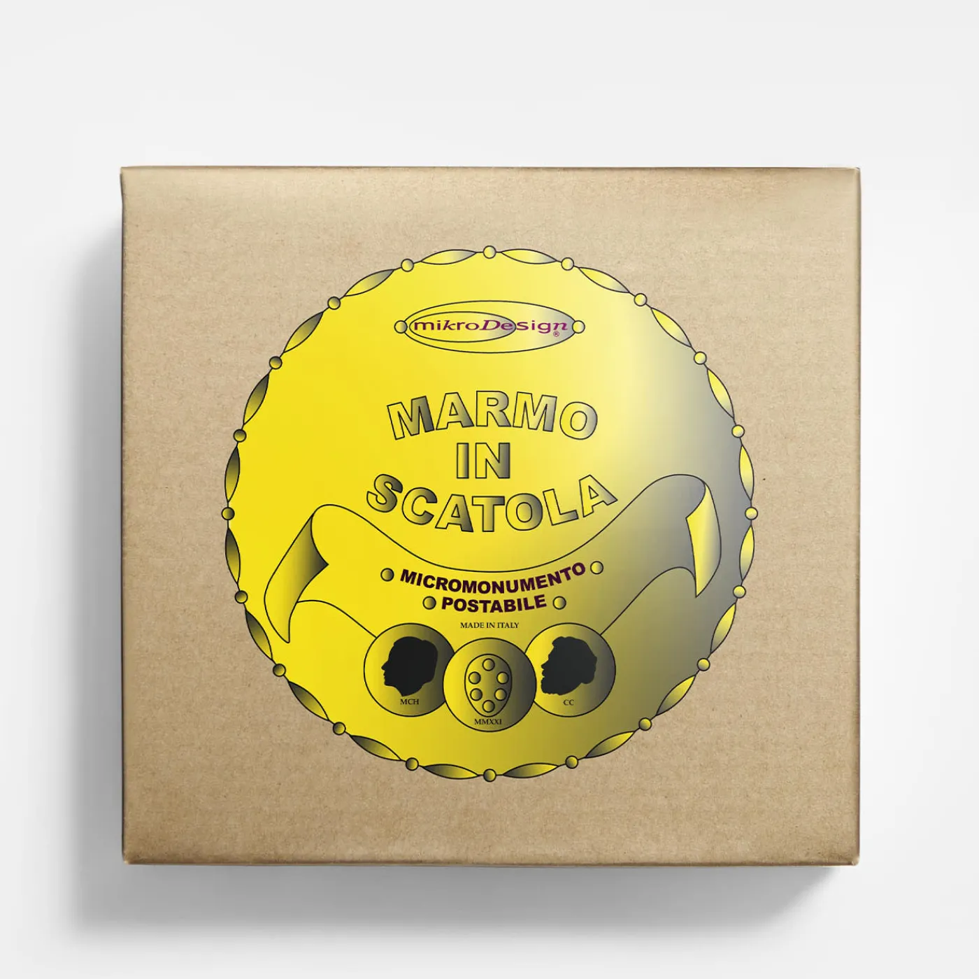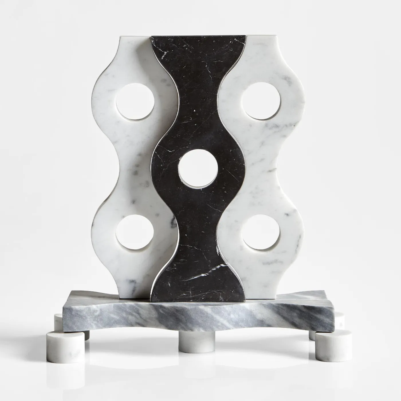 Optic riprende il tema di una scultura itinerante e fa parte della collezione “Marble In Scatola”. Le forme si ispirano alle linee sinuose spesso utilizzate dal designer. In posizione verticale, sembra una piccola quinta. Scomponendola, la piccola scultura diventa piatta come un puzzle che viene riposto nella sua scatola. È realizzata a mano in marmo bianco di Carrara, tortora Bardiglio e nero Marquina.