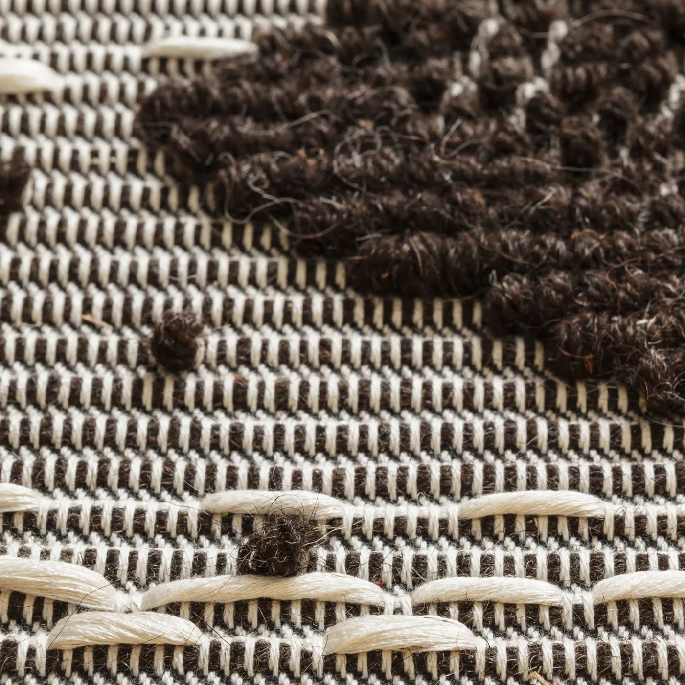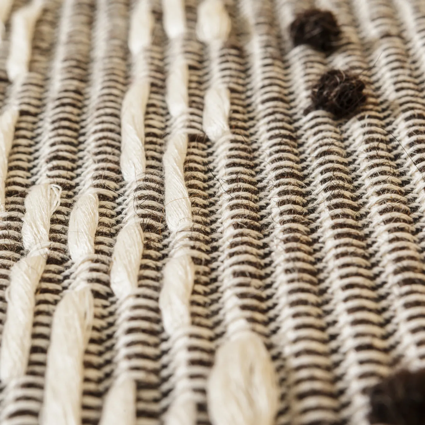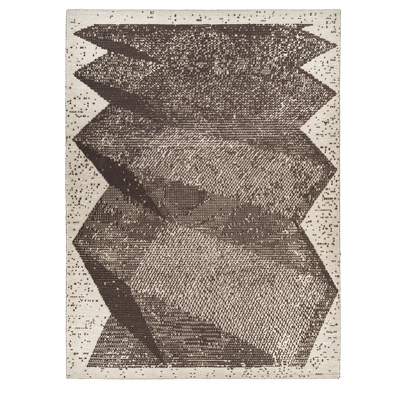 Questo tappeto di grande impatto, con i suoi solidi volumi geometrici in diverse tonalità di grigio e la mescolanza di seta liscia e lana color terra, presenta una decorazione ispirata alla prima grafica computerizzata degli anni Sessanta. La sua lavorazione utilizza in modo innovativo le tradizionali tecniche di tessitura sarda.