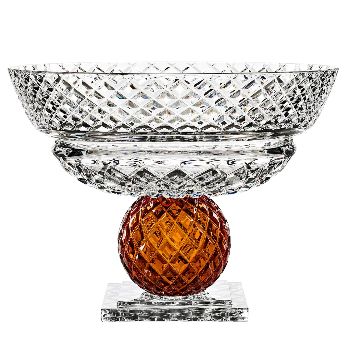 Vasi di dimensioni imponenti portati da una base e da una sfera che può essere trasparente o ambrata per portare un tocco di colore. Gli incroci tagliati a mano sulla superficie creano effetti di luce molto suggestivi. Artigianato e design diventano un tutt’uno per dare vita a una collezione pensata per regalare suggestivi effetti decorativi e sensazioni uniche. Completamente soffiato a bocca e tagliato a mano in puro cristallo al piombo.