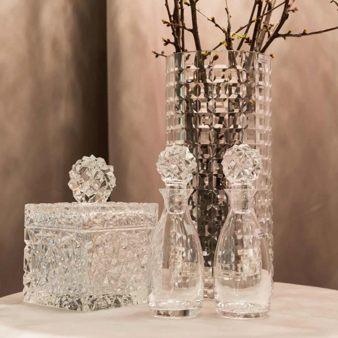 Una scelta eccellente per un bagno sofisticato, questo set di due bottiglie fa parte della collezione Spa Sinfonia. Realizzate appositamente per conservare ed esporre gli oli profumati, queste due bottiglie sono interamente in vetro trasparente e vantano una silhouette delicata, la cui finitura liscia è impreziosita sul fondo e sui tappi sferici da una suggestiva texture che aggiunge un accento dinamico, creando riflessi brillanti con la luce circostante.