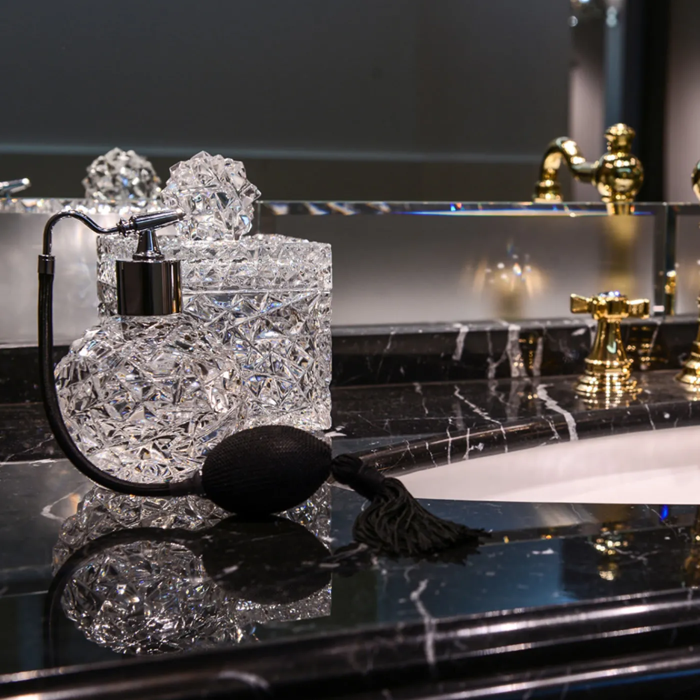 Superbo complemento per un bagno sofisticato, questo set di due scatole quadrate è stato realizzato in vetro trasparente. La superficie esterna di entrambi i pezzi è splendidamente ornata da una suggestiva texture che aggiunge un accento dinamico e raffinato ai pezzi, riflettendo la luce circostante per creare un ambiente lussuoso. La scatola alta è destinata a contenere i batuffoli di cotone (H 16,5 cm), quella corta i cotton fioc (H13 cm). Questo set, che fa parte della Spa Sinfonia, può essere combinato con gli altri della stessa serie per ottenere un look coeso.
