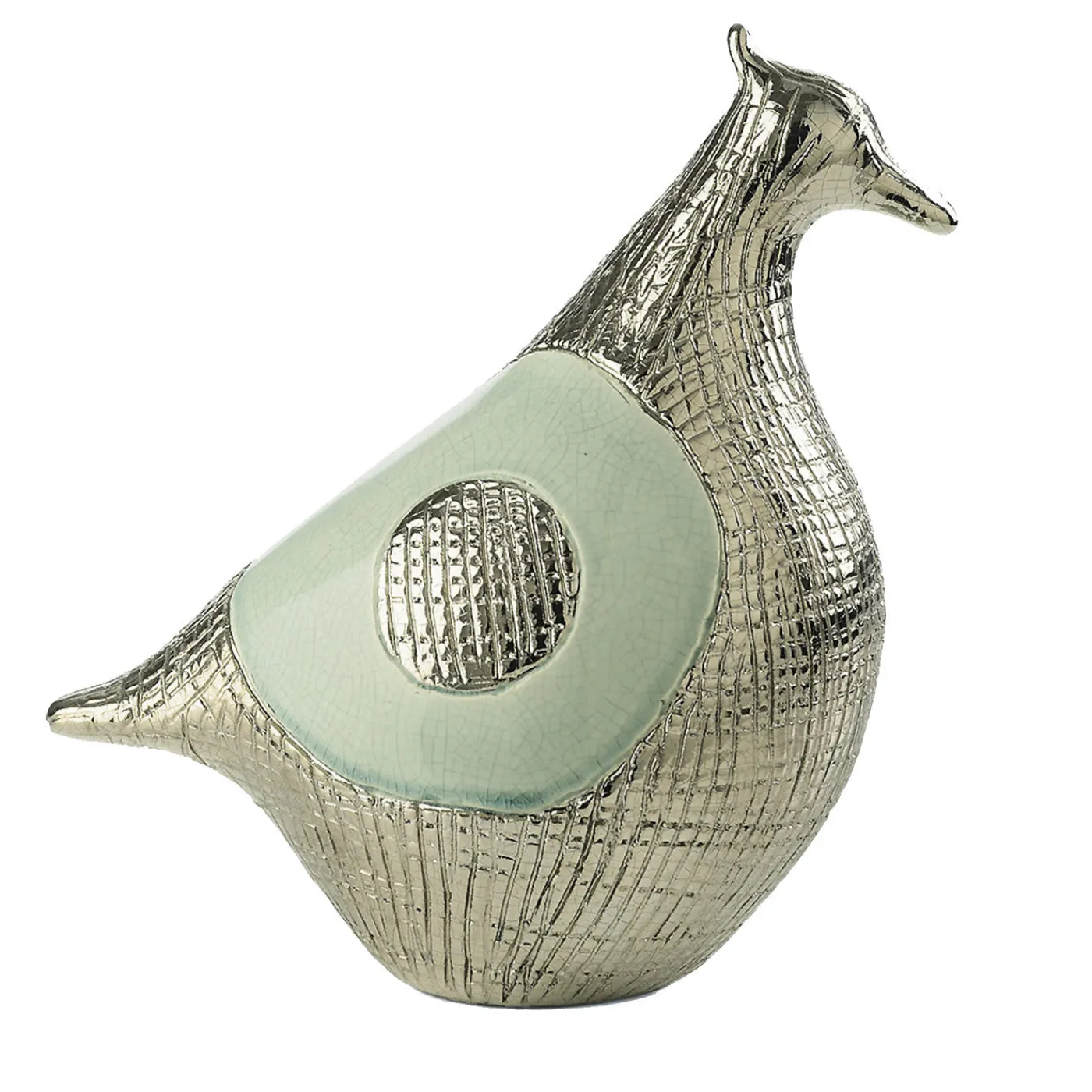 Stravagante ed elegante, questa statua stilizzata di uccello fonde il fascino della statuaria classica con la raffinatezza moderna. La silhouette raffinata del pezzo, il becco delicato, la cresta regale e la coda piumata sono delicatamente realizzati a mano, in ceramica. Sezioni di smalto liscio color tortora e di smalto strutturato color bronzo danzano sulla superficie del pezzo, con una giustapposizione che evoca la consistenza delle piume degli uccelli. Questo pezzo è un magnifico accento in uno studio o in un soggiorno e non mancherà di stupire.
