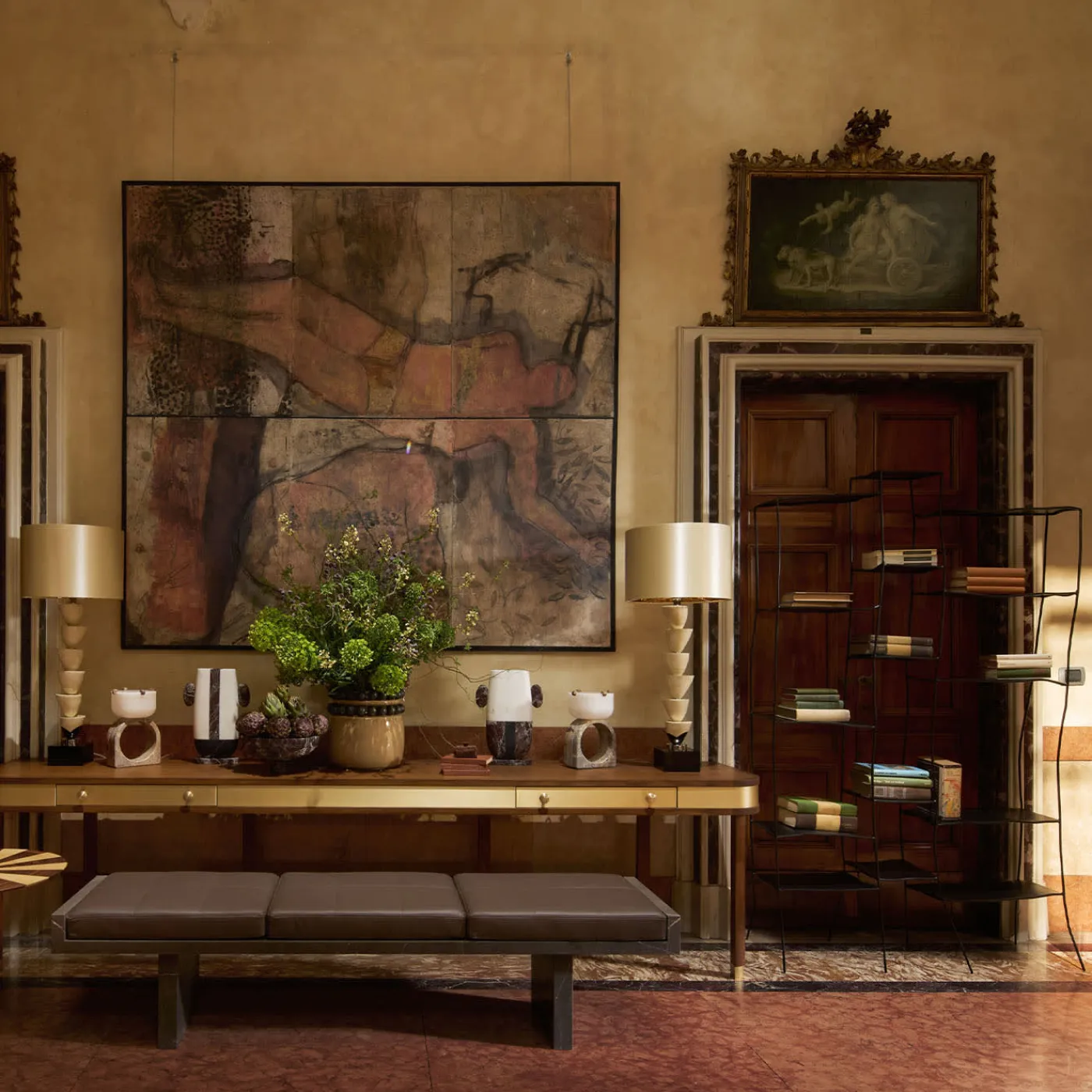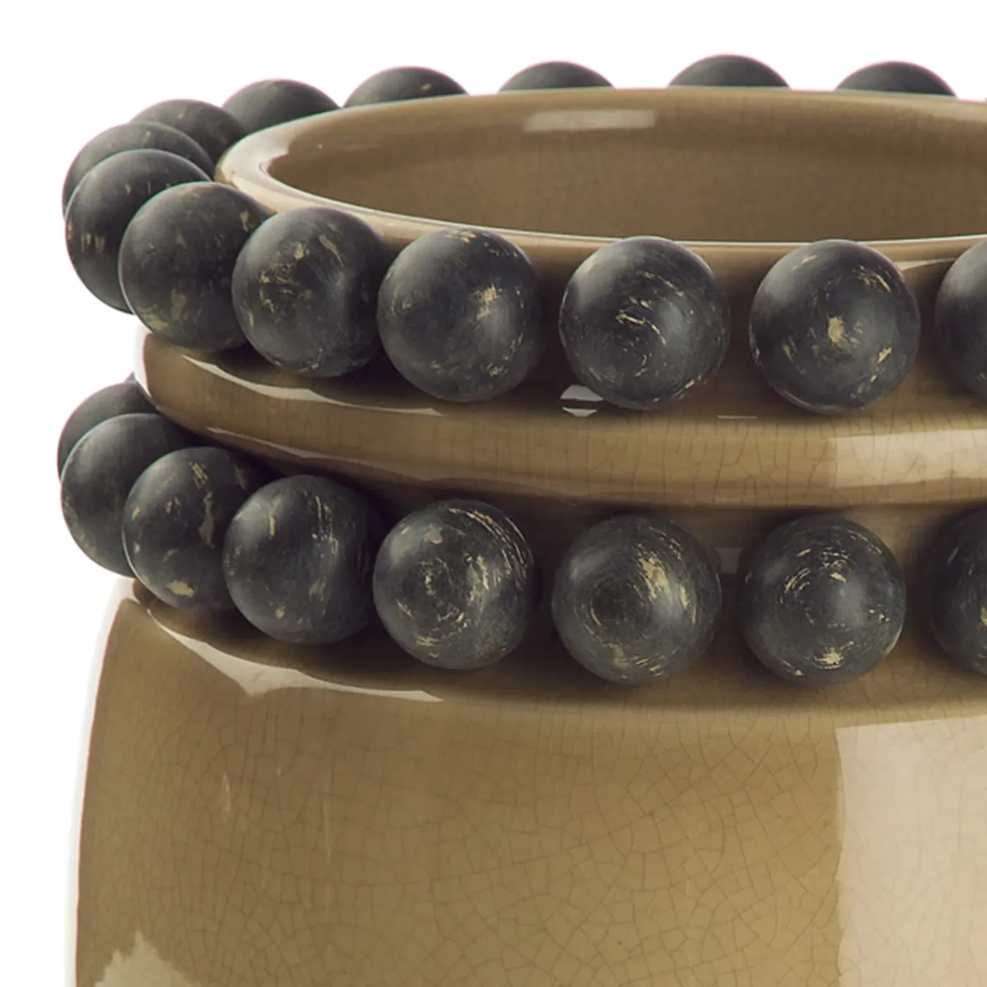 Questo sorprendente pezzo di arredamento funzionale può essere esposto da solo o combinato con gli altri pezzi Pike, per un look coeso. È stato realizzato interamente in ceramica con una finitura di smalto crepla sulla superficie color terra di Siena. Le delicate curve della sua silhouette sono ornate alla bocca da due file di sfere marrone scuro che creano una texture dinamica e una decorazione unica. Sono disponibili diversi colori. Si prega di consultare il concierge.