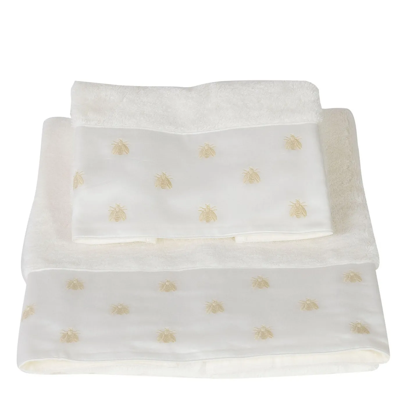 Il set di asciugamani Api Satin include due pezzi in morbida spugna di cotone, rifiniti con un bordo in satin applicato delicatamente ricamato con il motivo delle api firmato. Una combinazione raffinata di morbidezza e dettagli decorativi, ideale per elevare i rituali quotidiani con un tocco di lusso.
