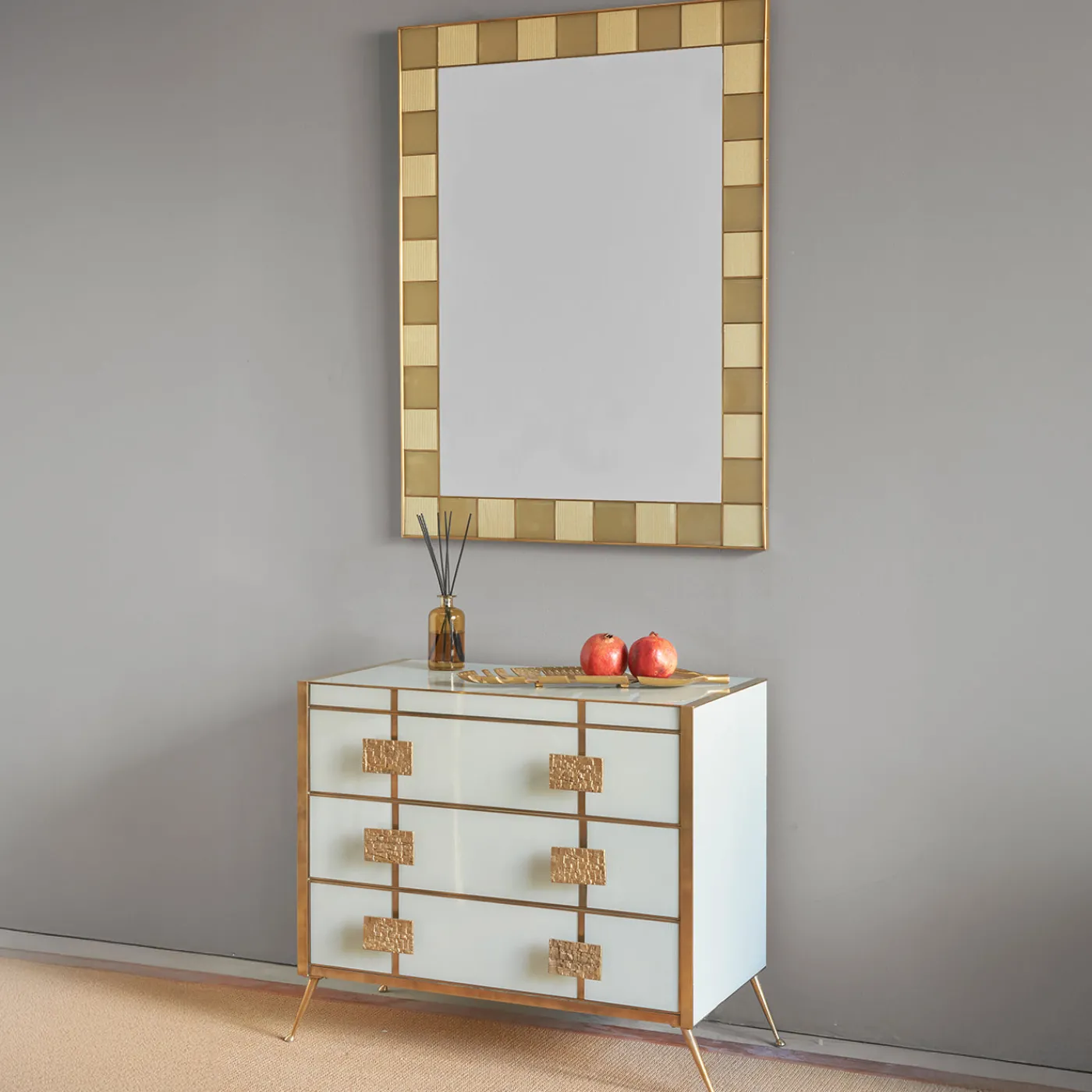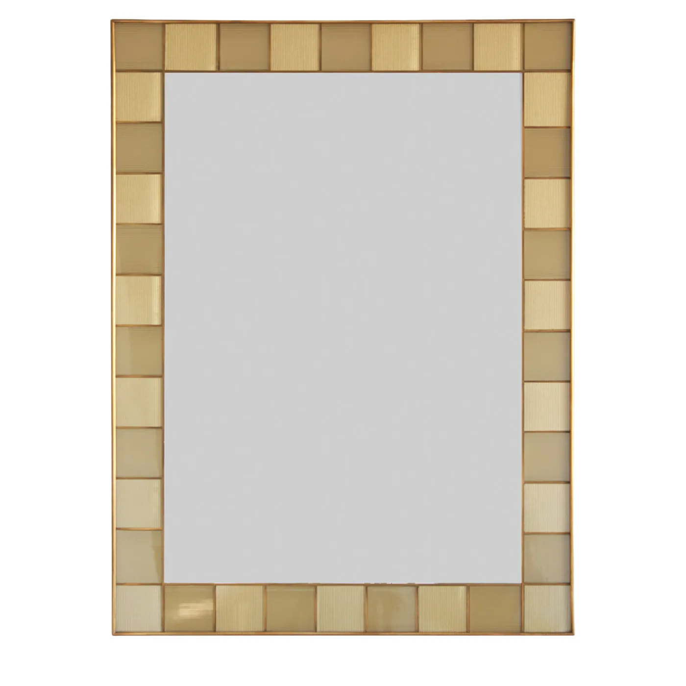 Specchio da parete rettangolare dal carattere distintivo, incorniciato da un motivo geometrico composto da piastrelle alternate in ottone satinato e vetro dorato texturizzato. Il contrasto tra superfici lisce e ondulate crea un affascinante ritmo visivo, amplificando la riflessione della luce e donando profondità al design. Con la sua eleganza essenziale e il gusto contemporaneo, questo specchio si presta a valorizzare ambienti interni diversi, aggiungendo un tocco di sobria raffinatezza.