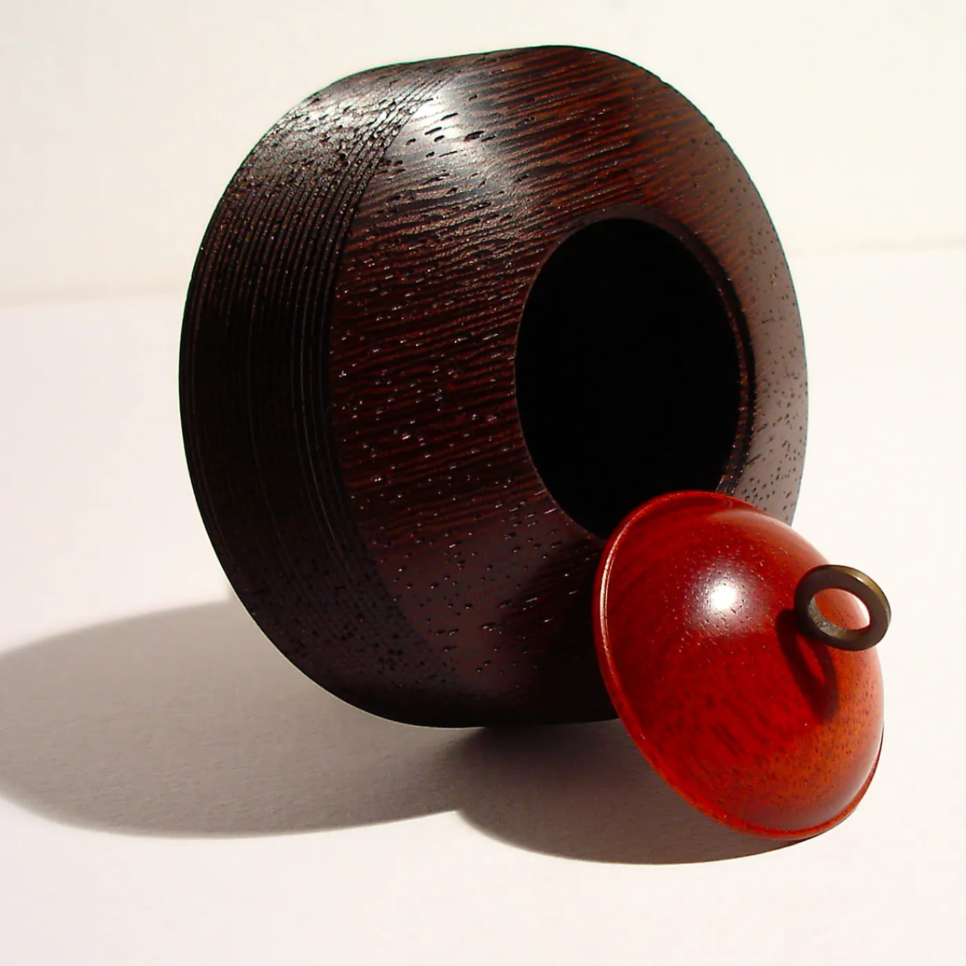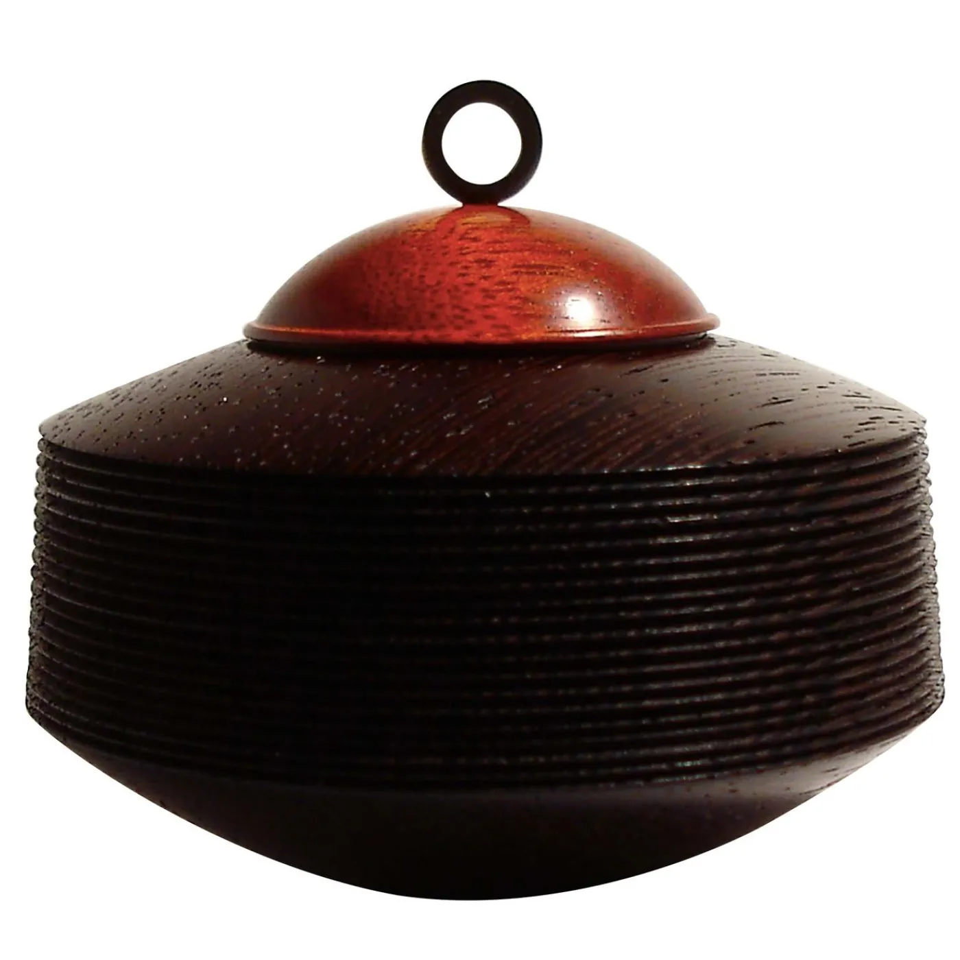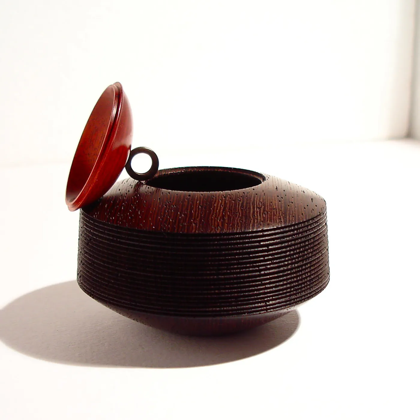 Questa piccola e leggera scatola con coperchio fa parte della collezione Obox, caratterizzata da forme semplici realizzate a mano con legni pregiati e da un caratteristico pomello ad anello in ottone acidato. Raffinata aggiunta a una collezione personale e scelta perfetta per qualsiasi occasione di regalo, questa scatola presenta una base alta e circolare in wengè con delicate creste orizzontali e un piccolo coperchio a forma di cupola in Muirapiranga con una splendida tonalità arancione.