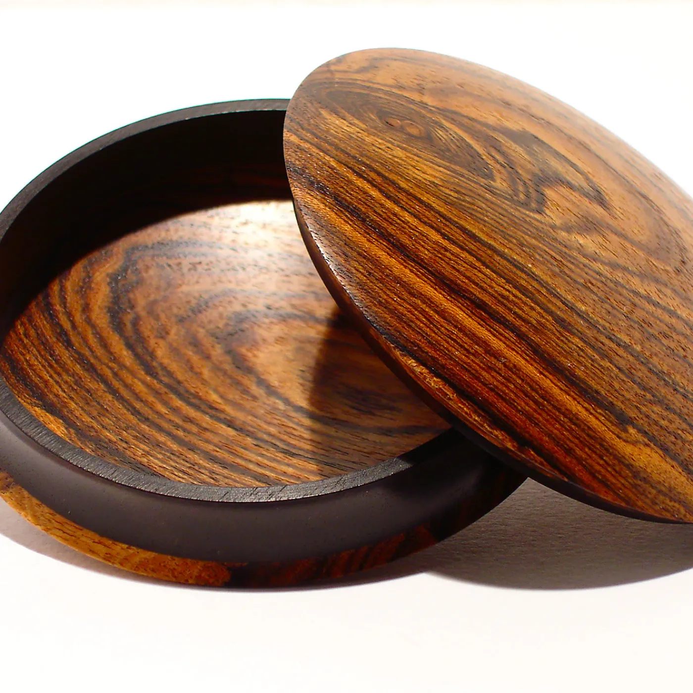 Le squisite venature del legno di Bocote, con linee curve scure e volute su uno sfondo marrone dorato, sono messe in mostra in questa sofisticata scatola della Collezione Bombè. Composta da due pezzi rotondi lavorati al tornio con una leggera forma convessa, l’ampia fascia incassata al centro in ebano Camerun crea una silhouette attraente e funzionale. Questa scatola è rifinita con un rivestimento di olio e cera naturale per proteggere il legno pregiato ed esaltarne la naturale bellezza.