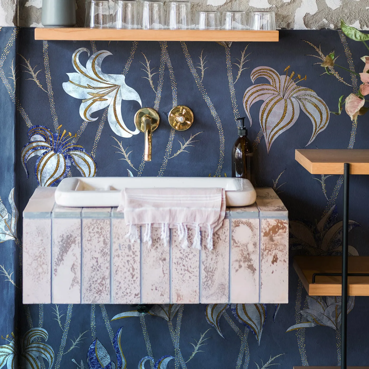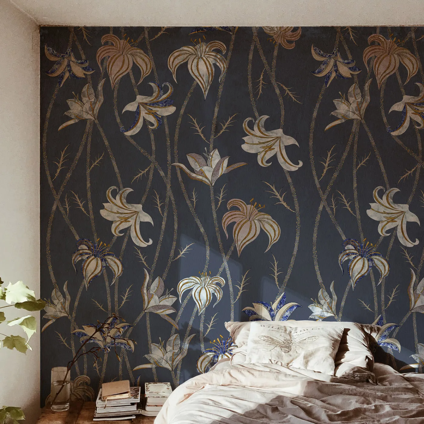 Steli sottili e lunghissimi corrono lungo tutta la parete, per terminare come fiori leggerissimi di Lilium Lancifolium, meglio conosciuto come Giglio di Tigre. Osservando attentamente i disegni di questi fiori, è possibile scorgere colori e texture che fanno parte di un’altra realtà: l’antica tecnica denominata Scagliola, l’Arte della Luna. La carta da parati Fiori è liberamente ispirata a questa antichissima arte, che consisteva nella sapiente lavorazione del gesso. Questo veniva poi utilizzato per sostituire materiali più preziosi.