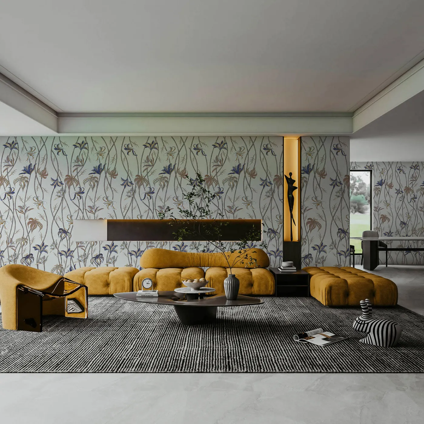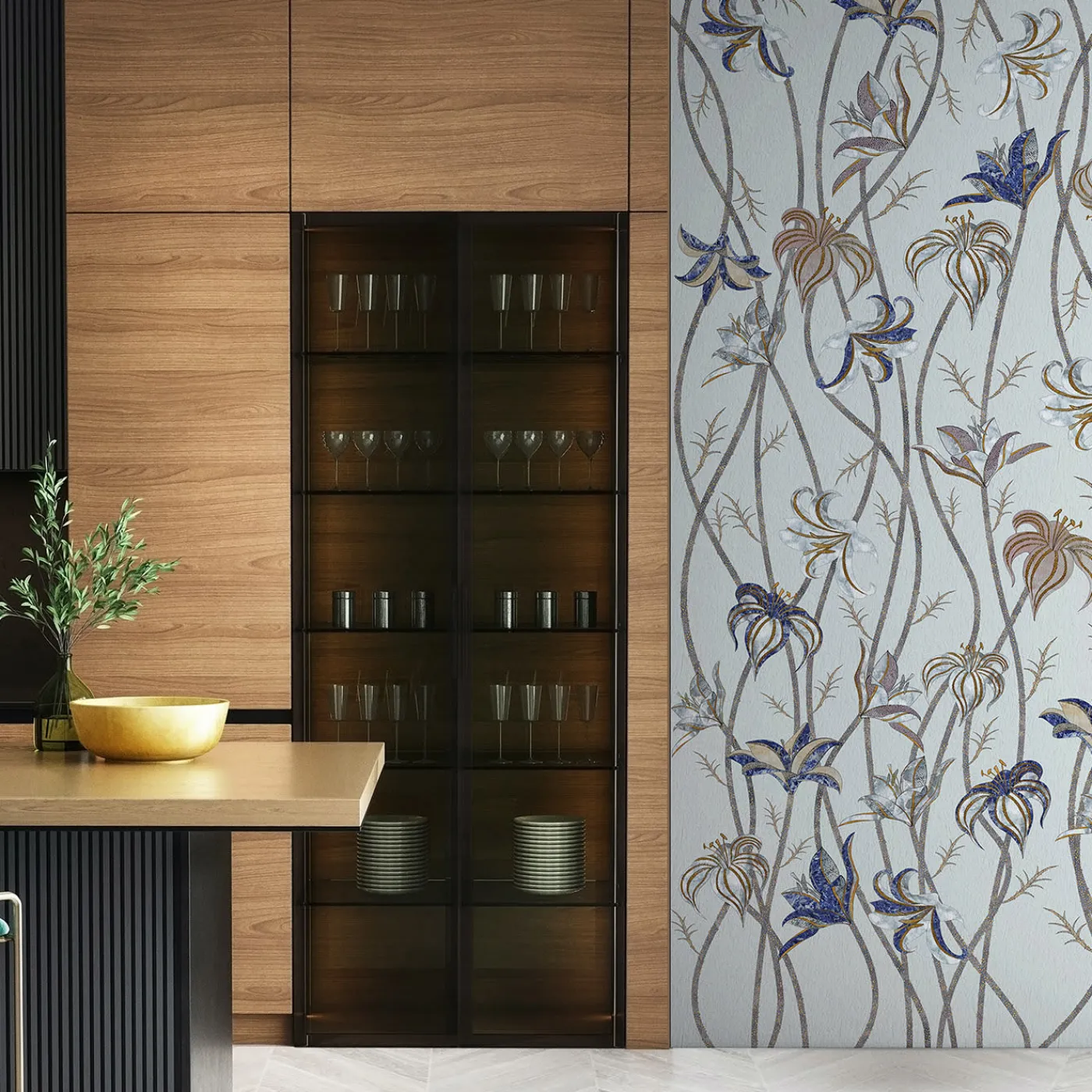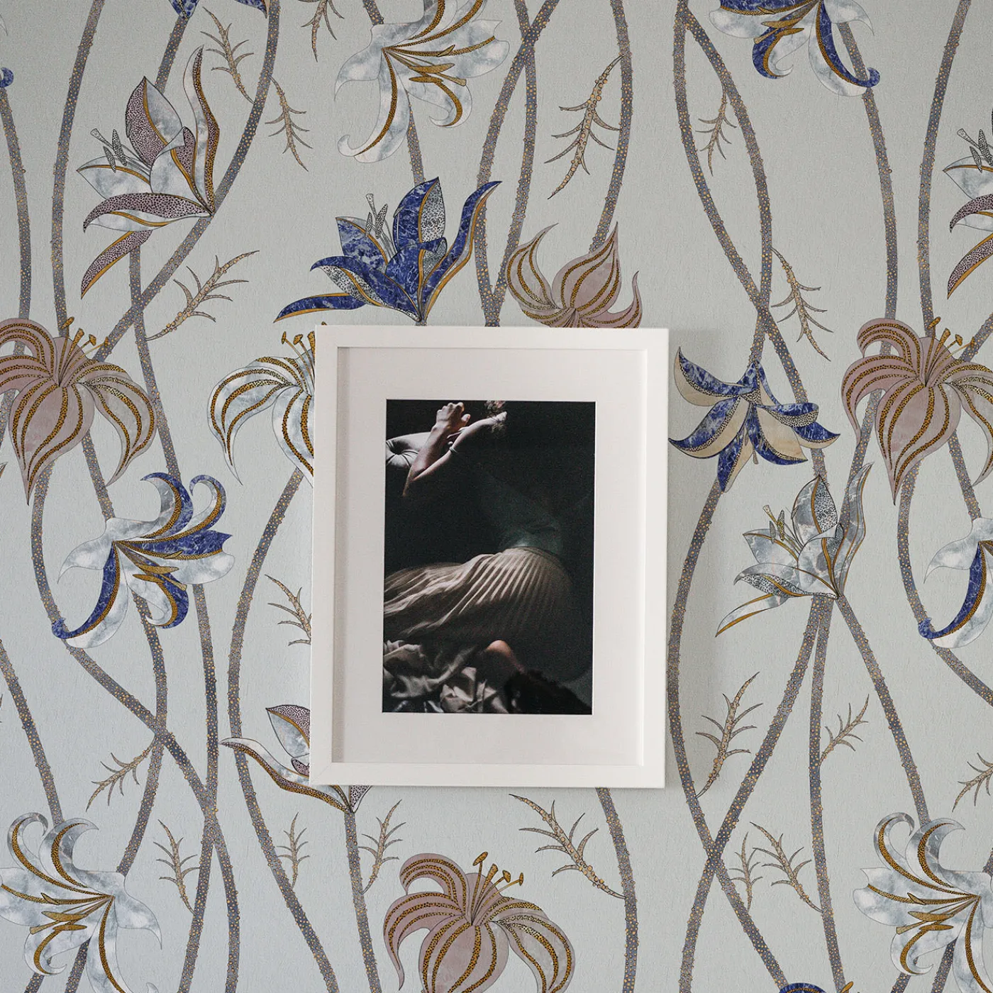 Steli sottili e lunghissimi corrono lungo tutta la parete, per terminare come fiori leggerissimi di Lilium Lancifolium, meglio conosciuto come Giglio di Tigre. Osservando attentamente i disegni di questi fiori, è possibile scorgere colori e texture che fanno parte di un’altra realtà: l’antica tecnica denominata Scagliola, l’Arte della Luna. La carta da parati Fiori è liberamente ispirata a questa antichissima arte, che consisteva nella sapiente lavorazione del gesso. Questo veniva poi utilizzato per sostituire materiali più preziosi.