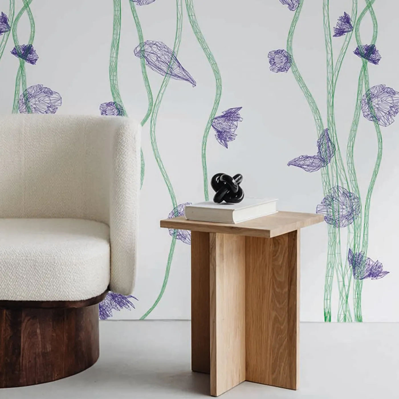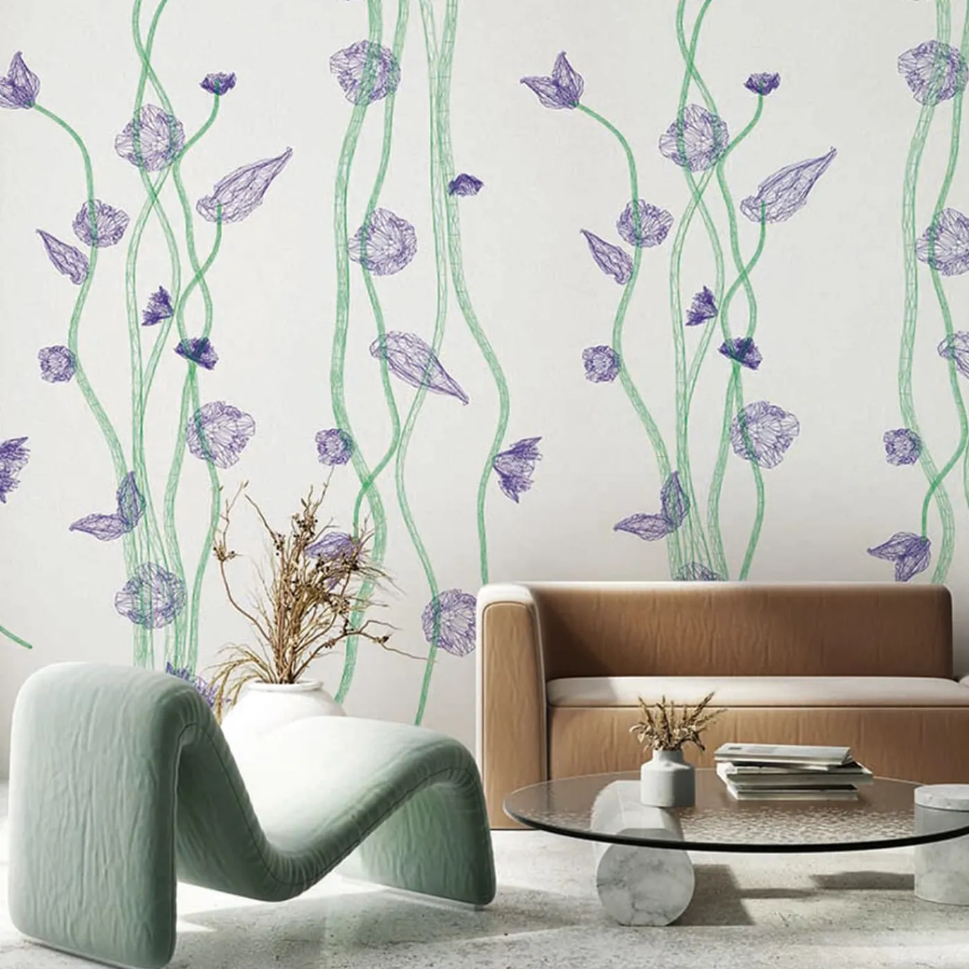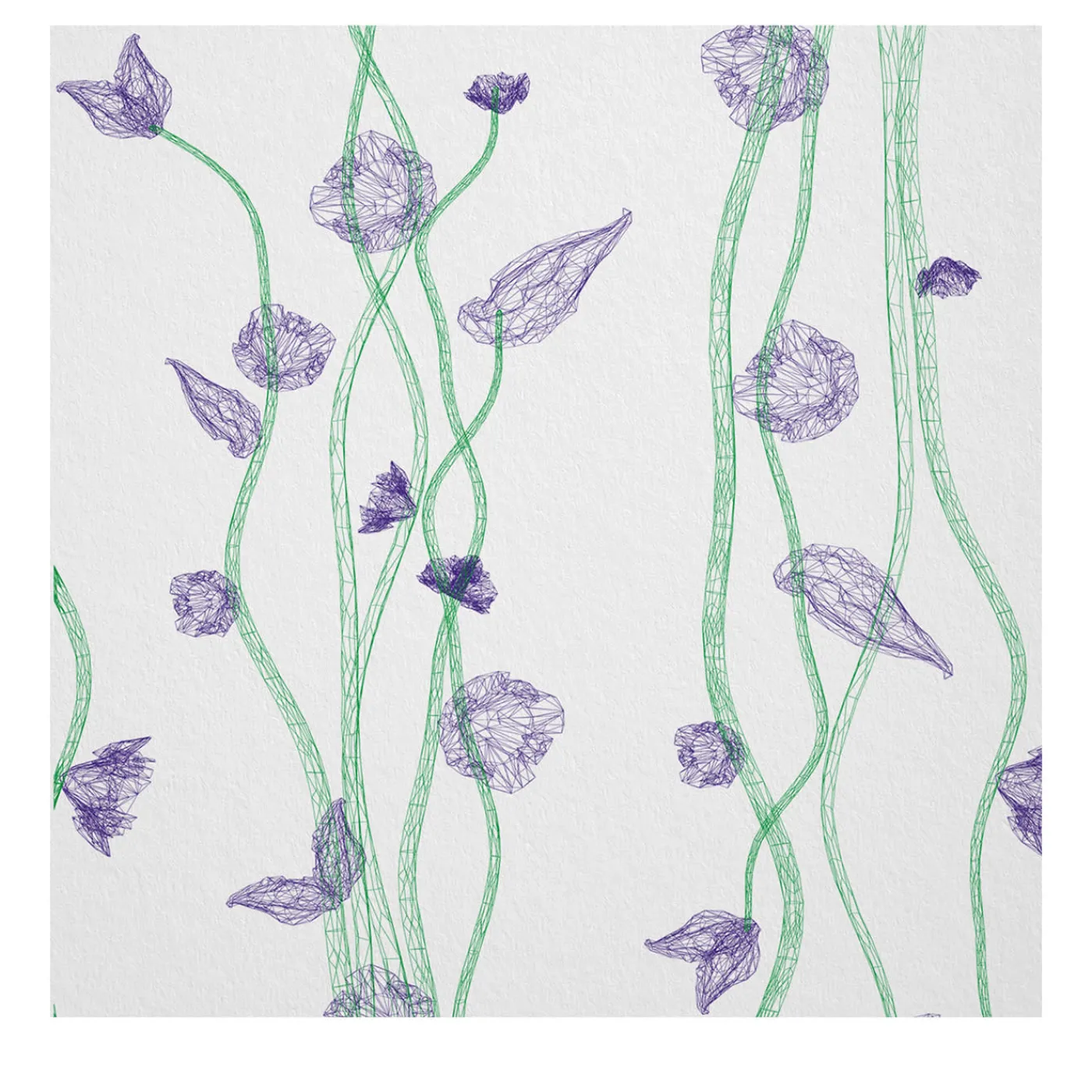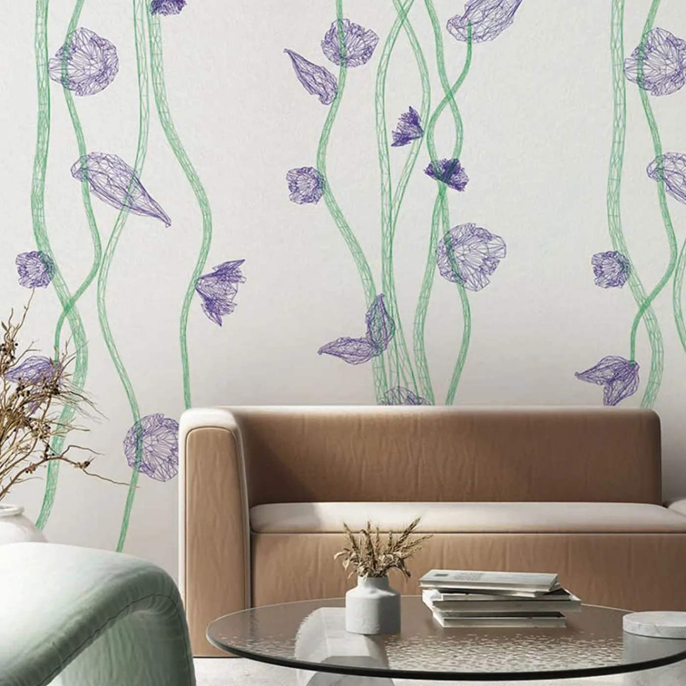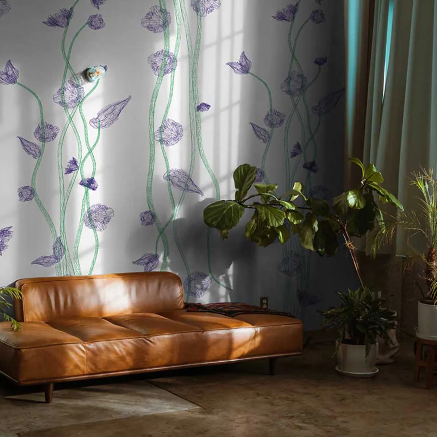 Il lavoro di Antonio Barbieri fonde forme 3D in un contesto razionale 2D utilizzando la tecnologia di scansione, creando un ritmo decorativo dalle forme naturali. Radicata nella tradizione della pittura murale, fonde la natura con la tecnologia. Parte della Collezione Essenziali dello Spazio Miscellanea by MaVoix VOL I, presenta una base bianca con soggetti verdi e viola, con un prezzo al metro quadro. Stampata su carta da parati ecologica FINE ART con finitura opaca, disponibile anche su texture CANVAS.