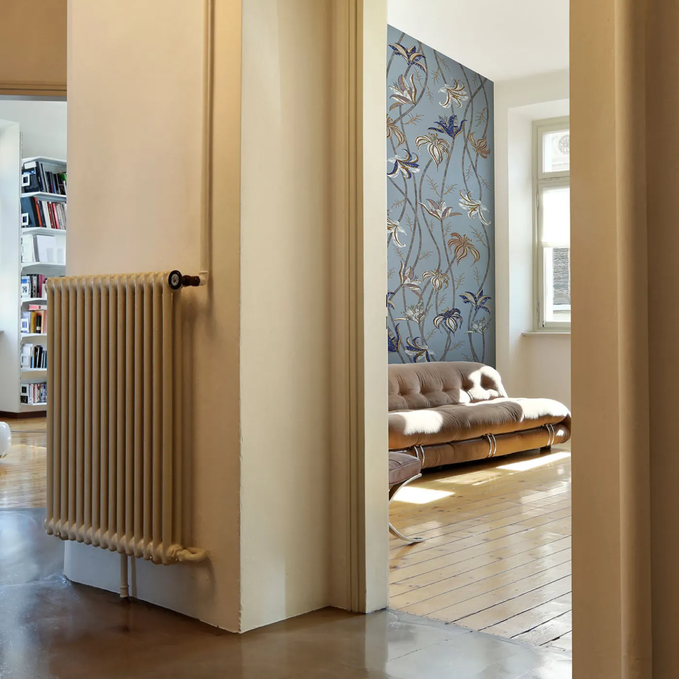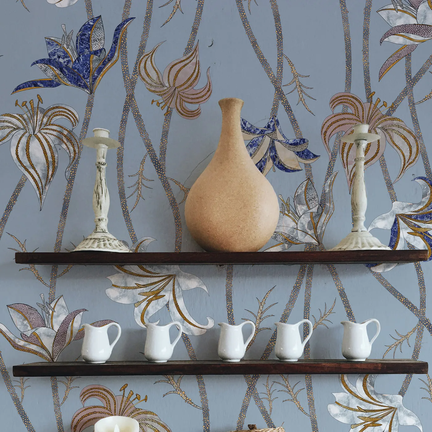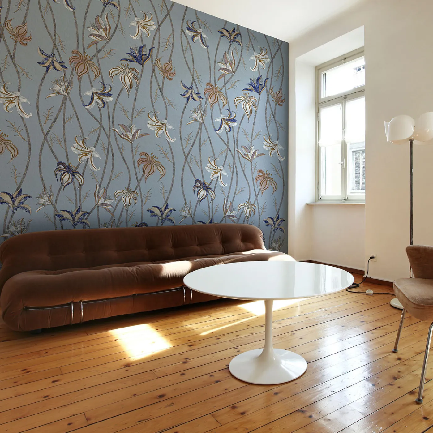 Steli sottili e lunghissimi corrono lungo tutta la parete, per terminare come fiori leggerissimi di Lilium Lancifolium, meglio conosciuto come Giglio di Tigre. Osservando attentamente i disegni di questi fiori, è possibile scorgere colori e texture che fanno parte di un’altra realtà: l’antica tecnica denominata Scagliola, l’Arte della Luna. La carta da parati Fiori è liberamente ispirata a questa antichissima arte, che consisteva nella sapiente lavorazione del gesso. Questo veniva poi utilizzato per sostituire materiali più preziosi.