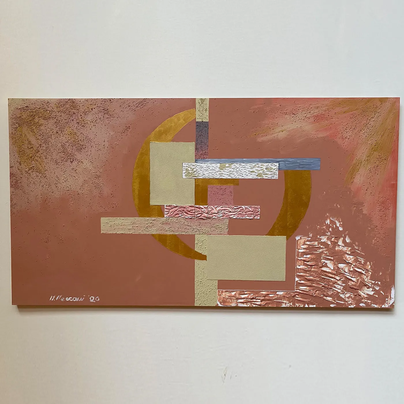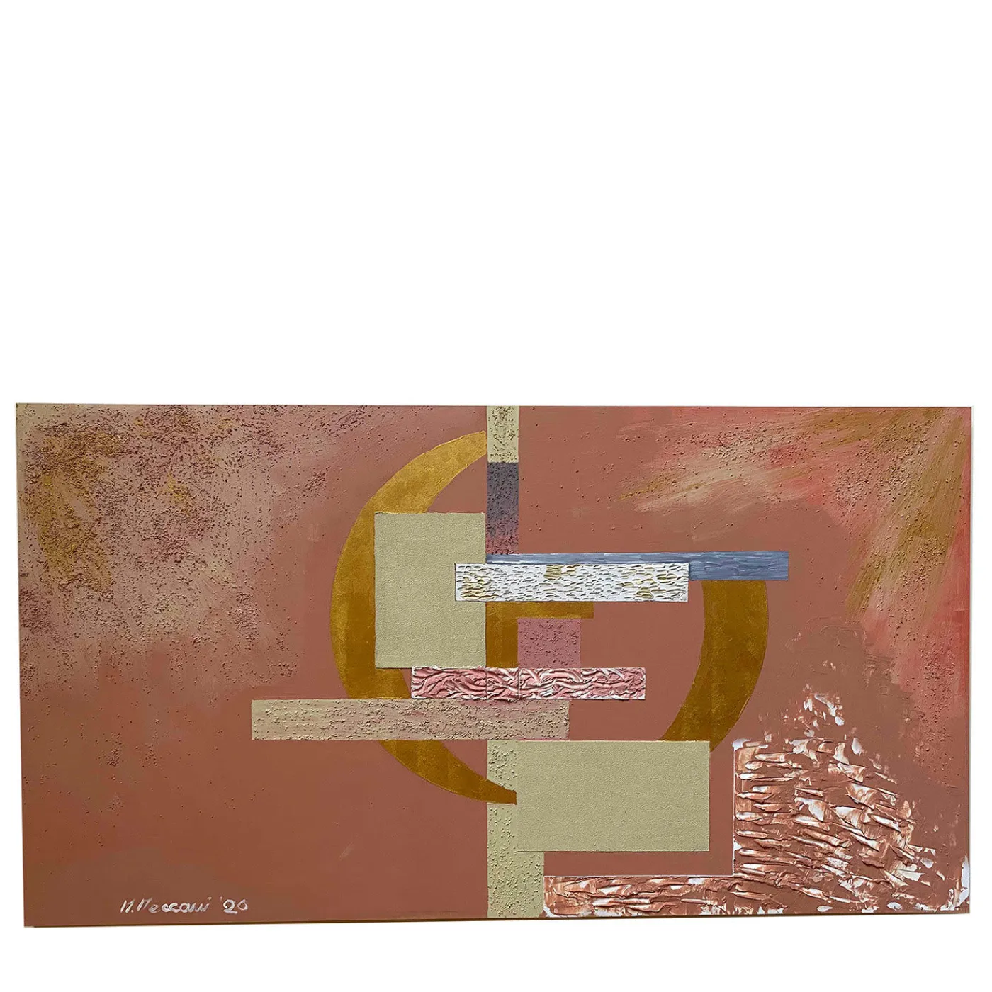 Disegnato dall’artista toscana Mascia Meccani nell’ambito della serie Geometrie, questo pannello da parete è una decorazione accattivante per una parete aperta. Il pezzo è interamente dipinto a mano su legno con tecniche miste, con strati di cemento con finitura a stucco e sabbia. Le forme geometriche astratte in grigio, oro, rosso, blu e bianco sono posizionate al centro di uno sfondo prevalentemente color ambra. Sono prevedibili variazioni rispetto all’articolo illustrato a causa dell’esclusivo processo di lavorazione a mano.