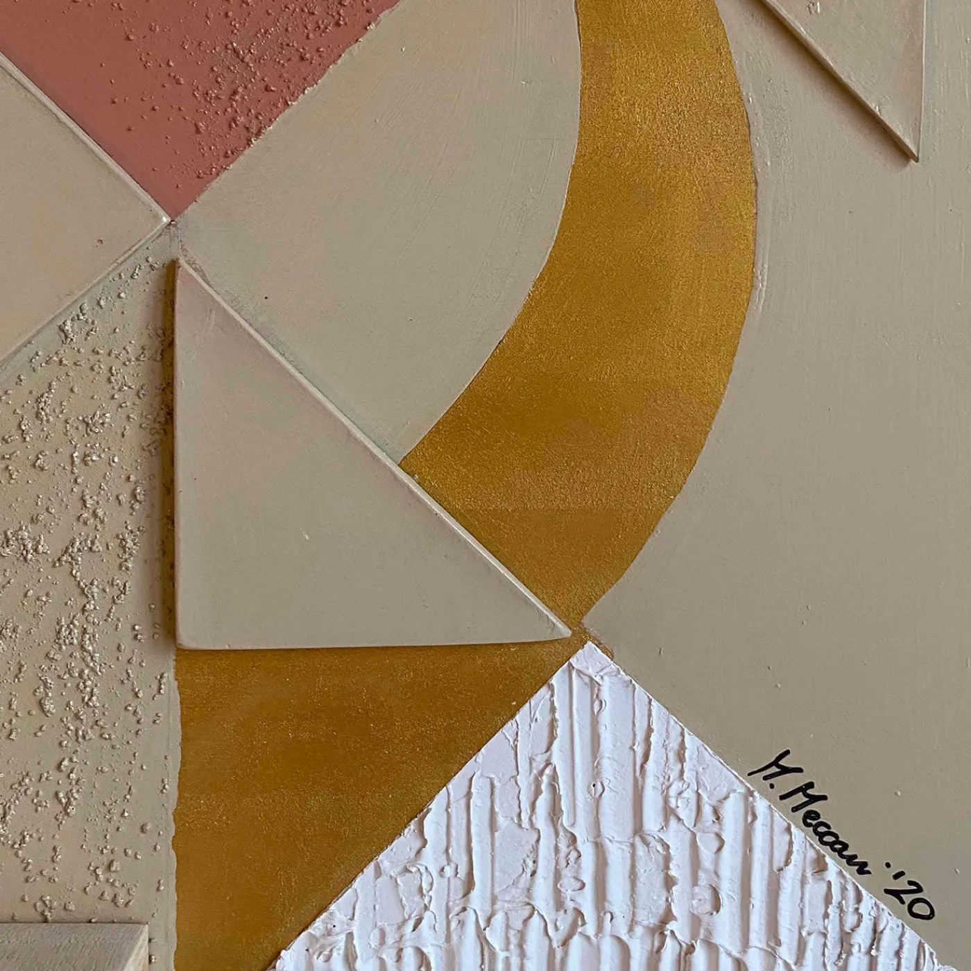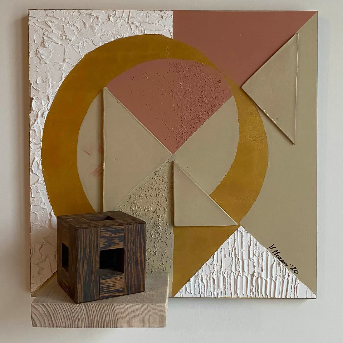Straordinario insieme di forme geometriche, tonalità e texture, questa spettacolare opera creata da Mascia Meccani nel 2020 sarà un’aggiunta singolare e iconica a un interno contemporaneo. Presenta un pannello decorativo in legno a tecnica mista arricchito da stucco, sabbia e terracotta e un’affascinante mensola realizzata a mano in legno di frassino. Questo pezzo è unico, ma può essere riprodotto in diverse dimensioni a scelta (si prevedono possibili variazioni nel design).