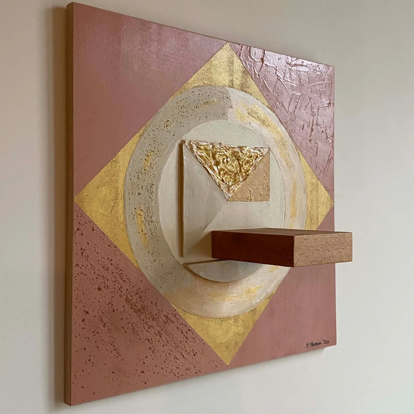 Un modo sorprendentemente inventivo di fondere arte e design, questa straordinaria opera del 2020 di Mascia Meccani è un affascinante pannello decorativo in legno a tecnica mista completato da una mensola in faggio. Interamente realizzato e dipinto a mano, presenta una calda tavolozza arricchita da stucchi, sabbia e terracotta. Questo pezzo è unico ma può essere riprodotto in diverse dimensioni su richiesta al Concierge.