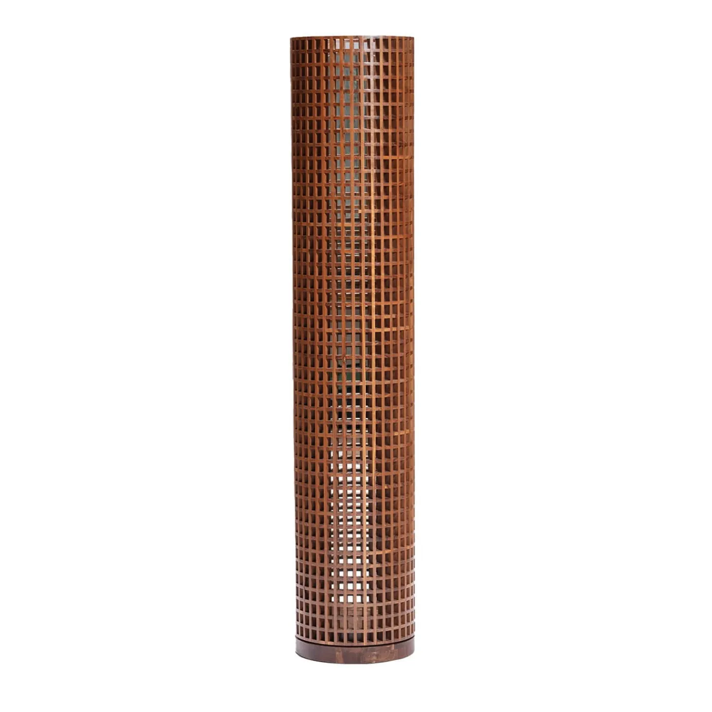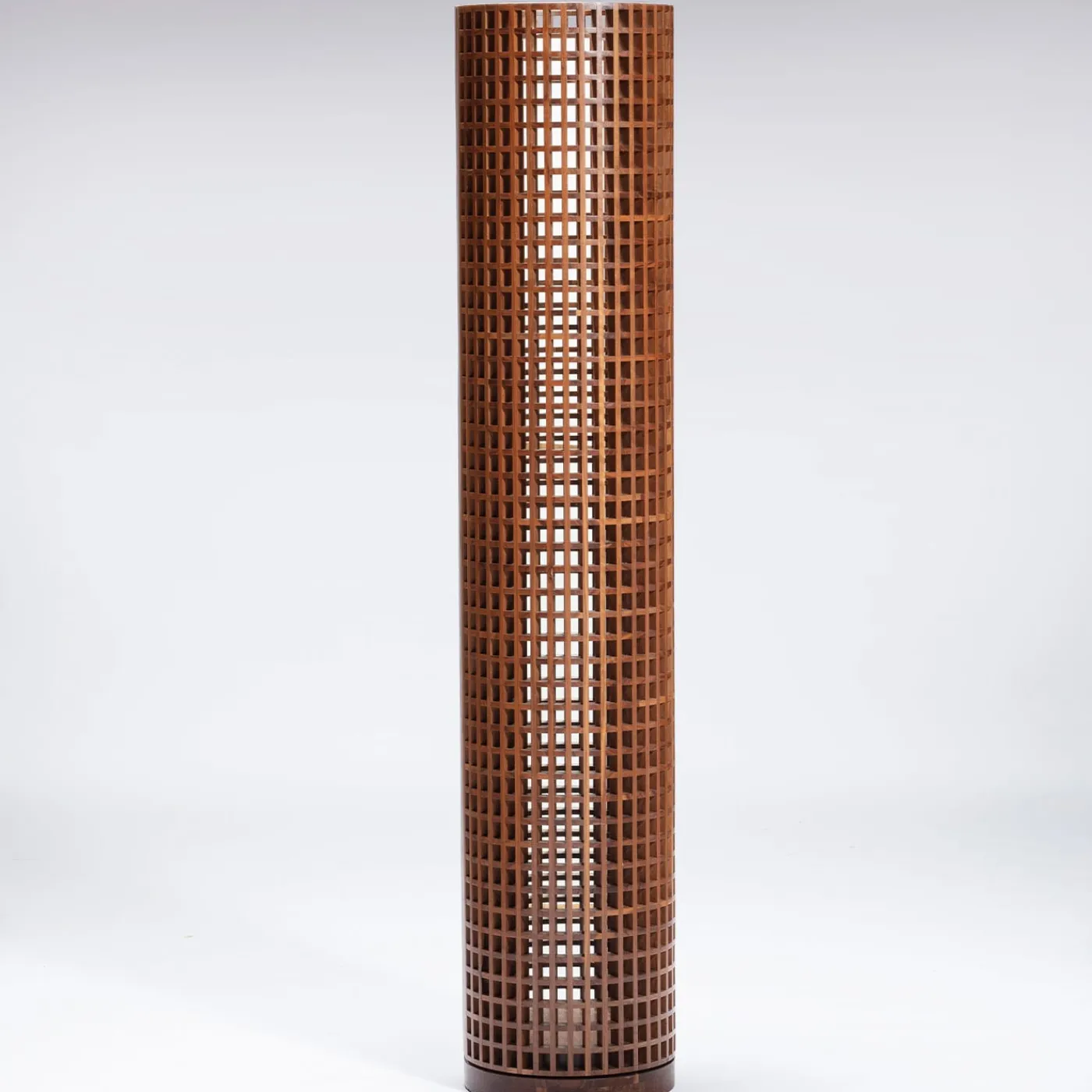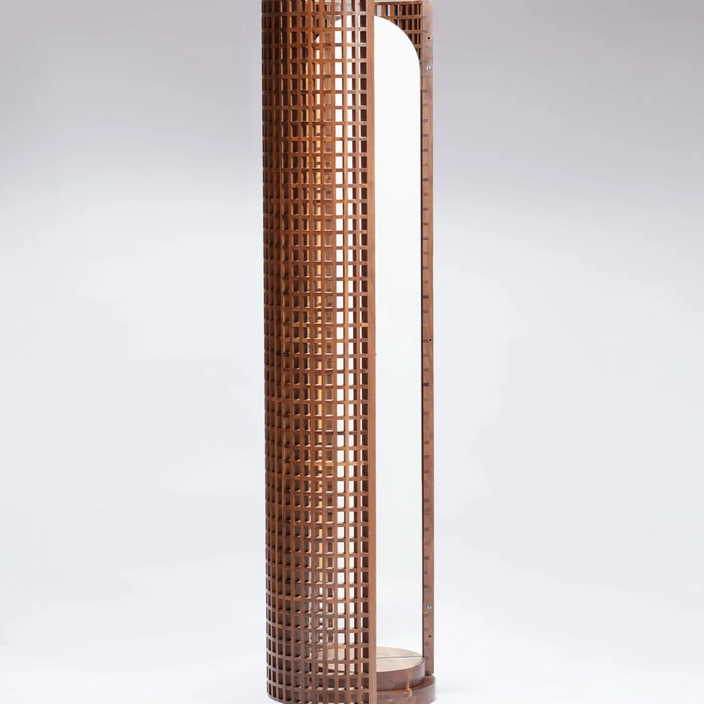 Uno stupendo design di stile senza precedenti, questo specchio da terra è un’eccezionale dimostrazione di meticolosa maestria artigianale. Elegante e contemporaneo, presenta una struttura cilindrica realizzata a mano in legno di noce canaletto, resa con sottili lamelle collegate da un gioco di linee incrociate e spazi vuoti, che si aprono su uno specchio verticale.