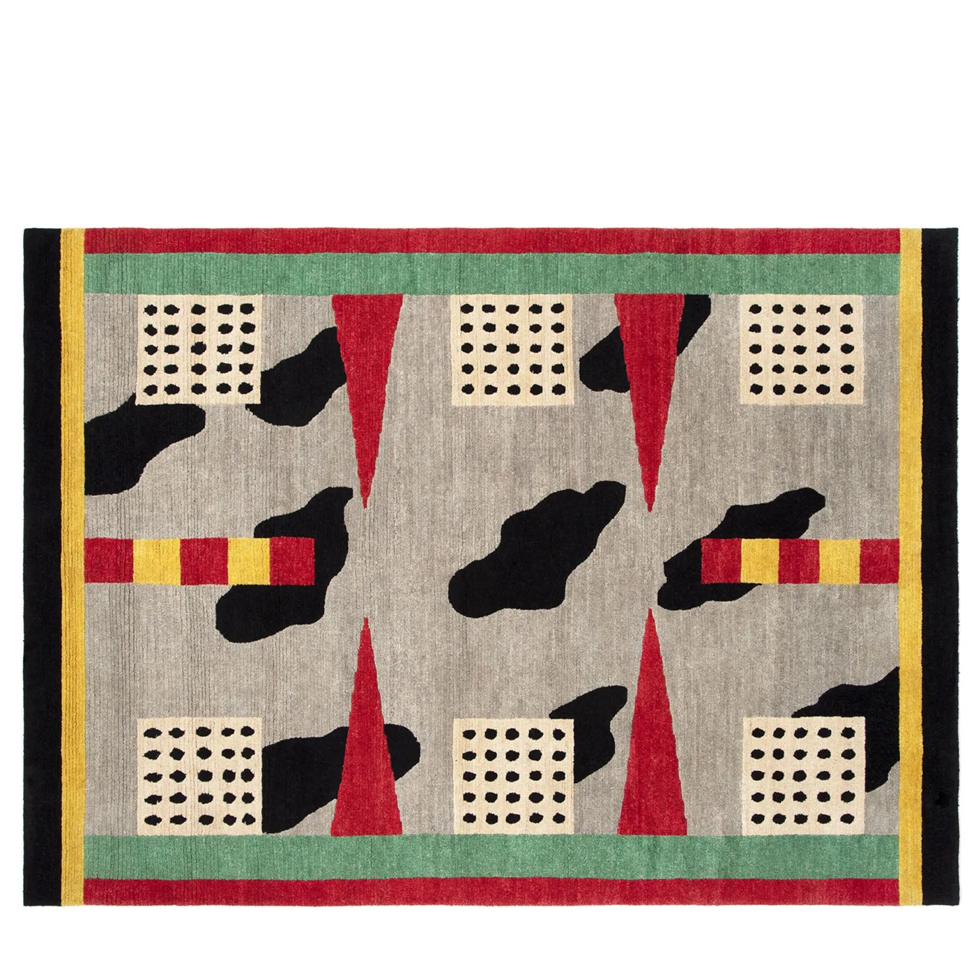 Questo straordinario tappeto in lana è stato progettato nel 1983 da Nathalie Du Pasquier. È completamente tessuto a mano e vanta una serie di elementi geometrici che creano un motivo simmetrico ravvivato da un uso sorprendente di colori contrastanti e da decorazioni a forma di nuvole asimmetriche che occupano casualmente il suo sfondo verde menta. Il risultato è audace e unico e conferirà un tocco eclettico a qualsiasi stanza in un interno moderno o contemporaneo.