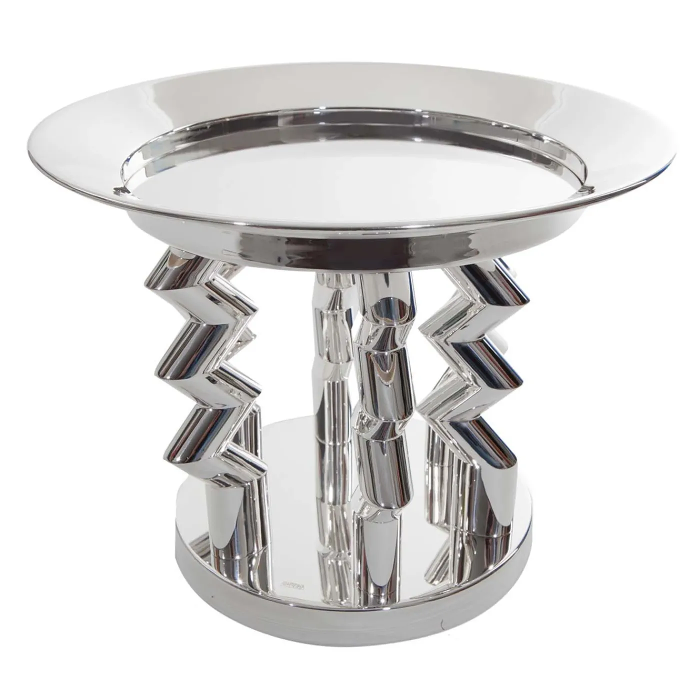 Questo affascinante centrotavola è stato progettato nel 1982 da Ettore Sottsass. La sua struttura in ottone placcato in argento comprende una base rotonda da cui si sviluppano sei elementi verticali a zig-zag che sorreggono il vassoio superiore a forma di piatto rotondo. Questo design unico è ispirato alla città esotica di Murmansk, nell’estremo nord-est della Russia. Questo elegante oggetto di decorazione funzionale è disponibile anche in argento 925 massiccio, si prega di chiedere al Concierge per dettagli e prezzi.