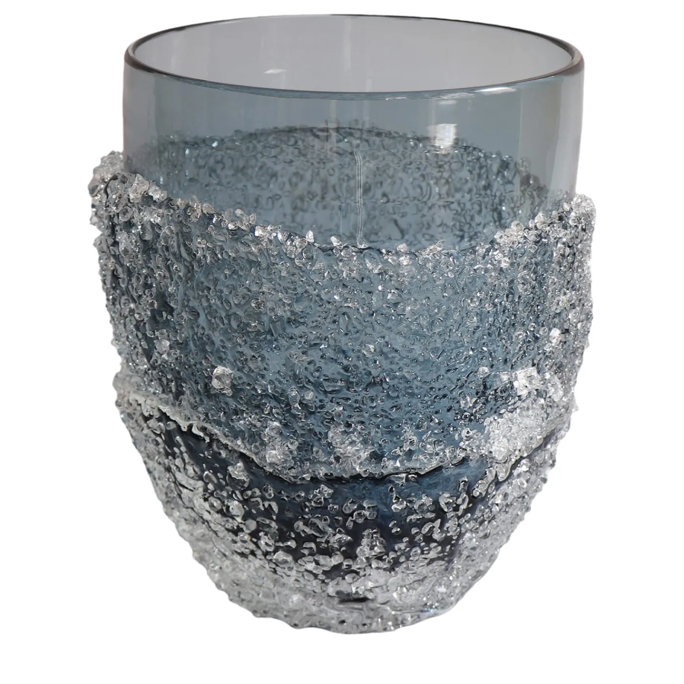 Ghiaccio – la parola italiana per indicare il ghiaccio – è l’effetto prodotto dai “Granzioli”, piccoli frammenti di vetro che ricordano il ghiaccio tritato. Per creare questa speciale texture, un letto di Granzioli viene applicato sul pezzo principale mentre è ancora incandescente. Il risultato è uno strato spesso e irregolare di granuli di vetro che avvolge la superficie del vaso. Per evidenziare il contrasto, una parte del vaso è lasciata scoperta e liscia.