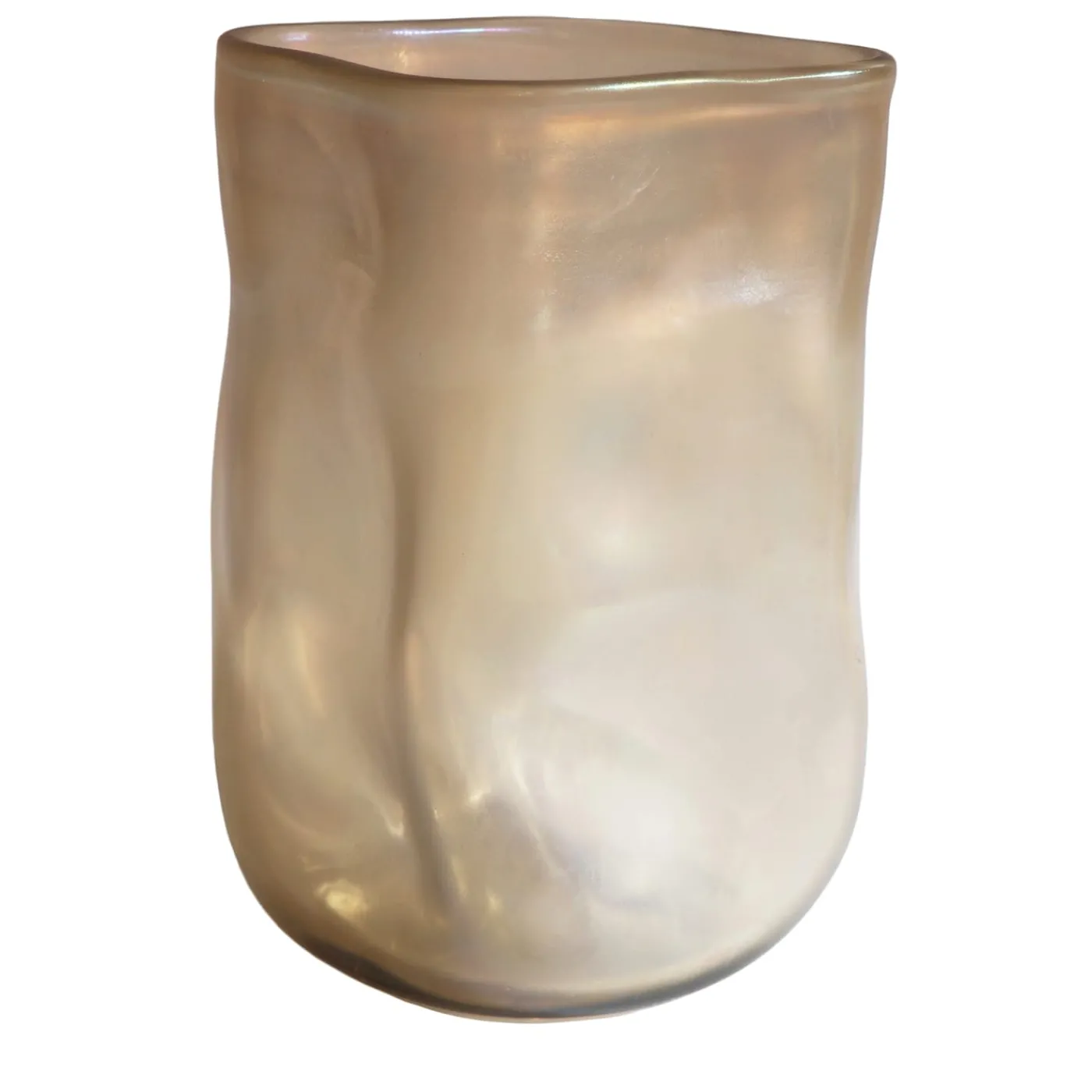 Contorto” quando il vetro è ancora malleabile e morbido, Sacco ricorda la forma di un sacco accartocciato. Una volta raffreddato, il vaso conserva questo senso di movimento che viene ulteriormente incantato dalla lucentezza iridescente che segue le sue curve. Questo vaso è realizzato a mano e firmato. Il processo di iridazione (rendere una superficie iridescente) conferisce al vetro un effetto visivo simile alla perla. Questo processo chimico si genera quando il vetro è ancora morbido e incandescente.