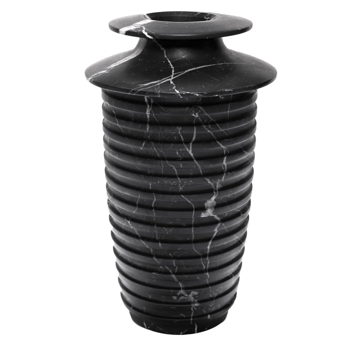 Una silhouette dinamica in pregiato marmo nero Marquina, segnata da una texture scanalata, definisce questo squisito vaso, il cui profilo si restringe drasticamente per dare forma alle linee sinuose e arrotondate che ne tracciano il collo. Le sottili venature bianche interrompono il nero profondo del marmo e il loro orientamento verso il cielo sembra evocare un’ispirazione lontana che unisce inaspettatamente le anfore greche e romane alla tradizione scultorea rinascimentale. Questo elegante pezzo è ideale per esporre composizioni floreali colorate Si prega di notare che i marmi e le pietre sono materiali naturali e possono differire anche se provenienti dalla stessa cava o dallo stesso blocco. Il prodotto mostrato può differire dagli articoli acquistati. Ogni pezzo è unico.