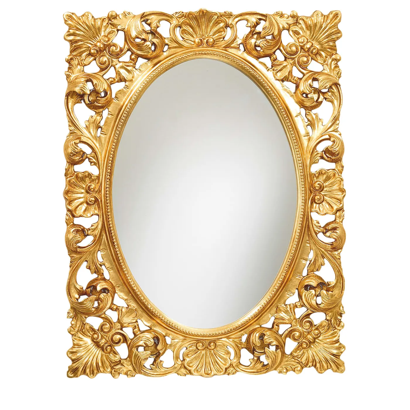 Splendido esempio di stile barocco, questo specchio da parete ovale si distingue per la qualità e i dettagli artigianali della sua cornice in legno. Scrupolosamente intagliata a mano per dare forma al suo trionfo di foglie d’acanto, la cornice che circonda il vetro specchiato in cristallo (spessore 4 mm) è infine rifinita a mano con uno strato di foglia d’oro anticato. Può essere appeso in verticale o in orizzontale.