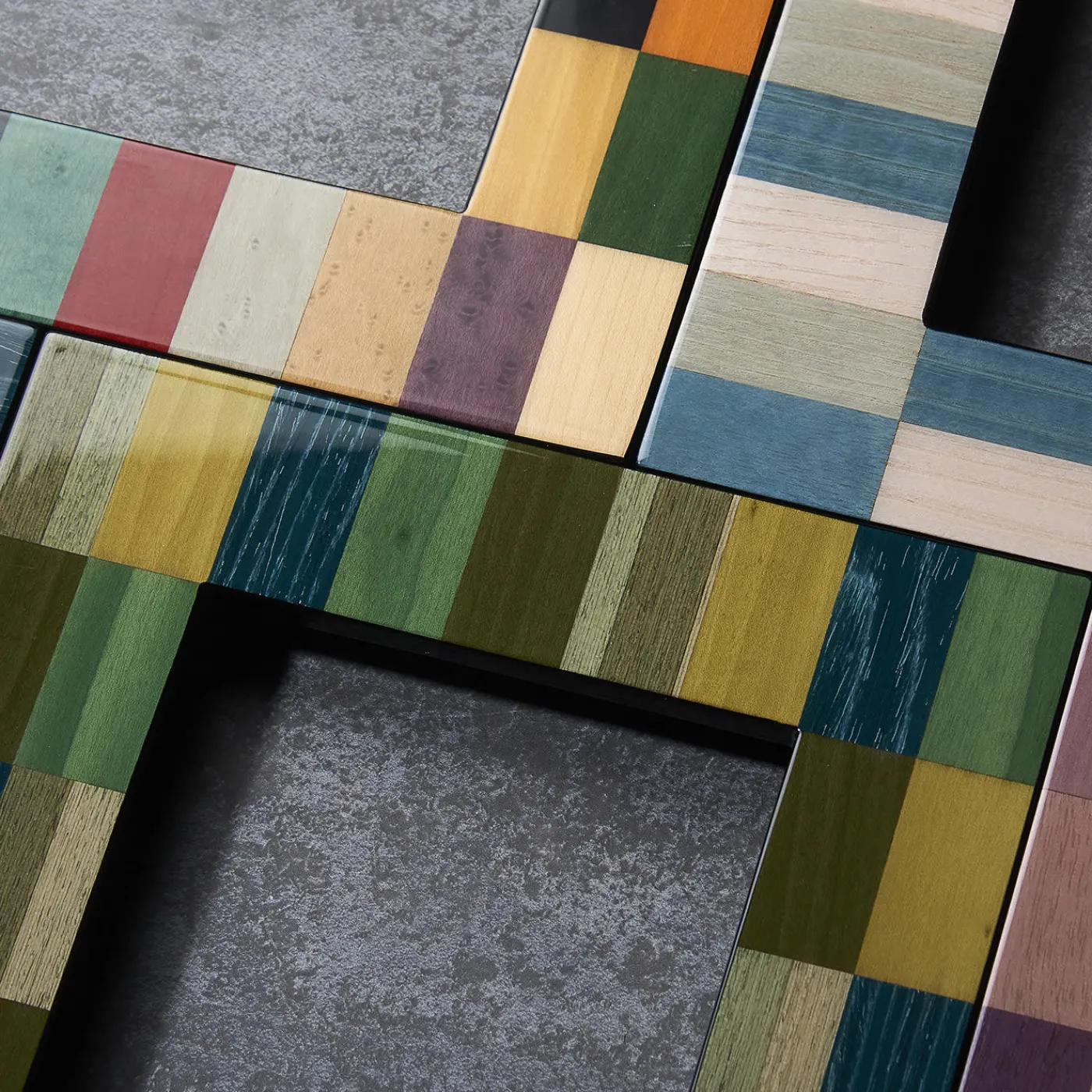 Originale ed elegante idea regalo per una persona cara, questo portafoto fa parte della Collezione Venezia Mestre di oggetti di design caratterizzati da motivi geometrici ispirati all’arte moderna. Interamente realizzato a mano in legno, presenta un’impiallacciatura audace e accattivante fatta di rettangoli intarsiati con toni di giallo, verde e blu che si abbinano senza sforzo a qualsiasi stile di arredamento.