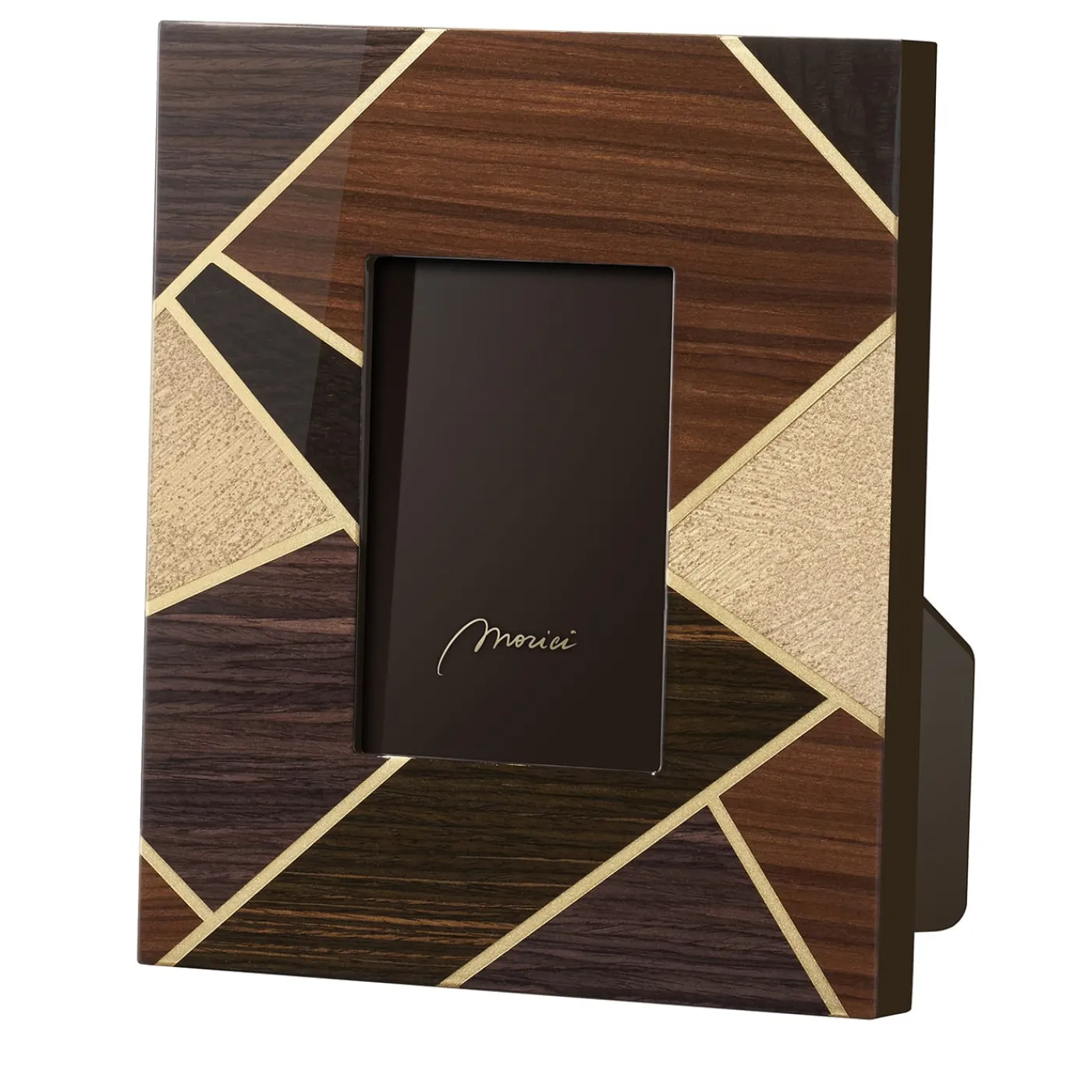 Abilmente realizzato a mano, questo design della collezione Tellux Vulcano è la soluzione perfetta per i ricordi preziosi che meritano un portafoto altrettanto prezioso. Le linee dorate compongono una rete dinamica che si estende su tutto il perimetro e che sottolinea ulteriormente il contrasto tra i pregiati intarsi in Bolivar, palissandro, ebano e frassino. Una finitura spazzolata e specchiata completa questo pezzo elegante e singolare.