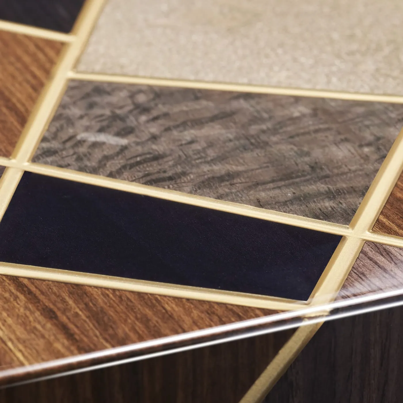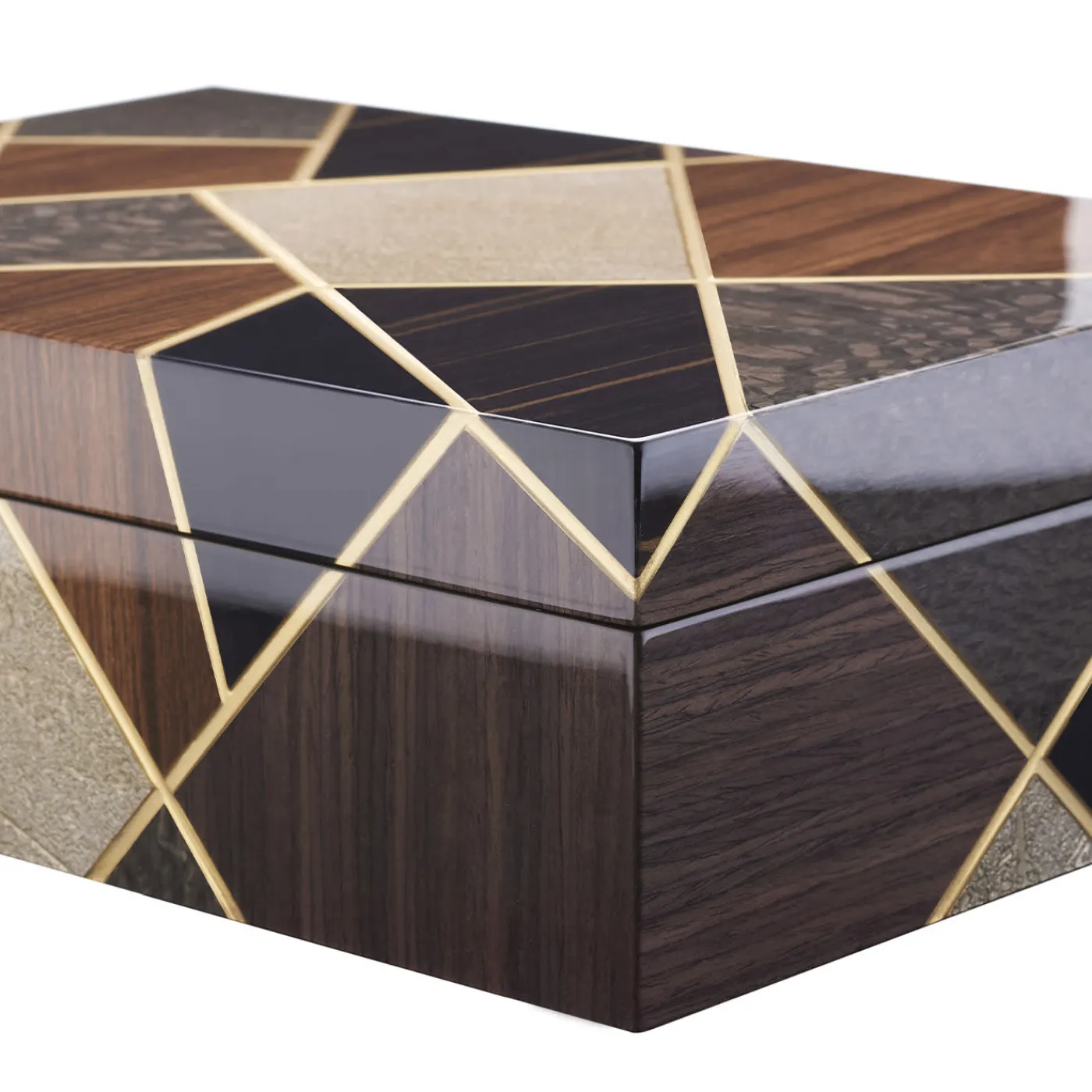 Uno splendido intarsio geometrico realizzato a mano e arricchito da accenti metallici contraddistingue questo portagioie unico nel suo genere. L’oro è versato a mano per tracciare i confini tra le diverse essenze di impiallacciatura: radica, palissandro, bolivar, frassino ed ebano, che vengono accentuati da una fase finale di spazzolatura e lucidatura. L’interno, rivestito in Alcantara, è dotato di due portaorologi, porta anelli e una fessura vuota per bracciali o collane.