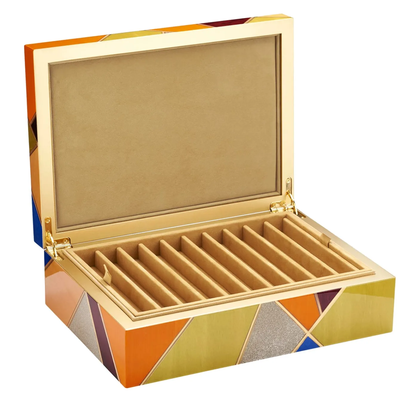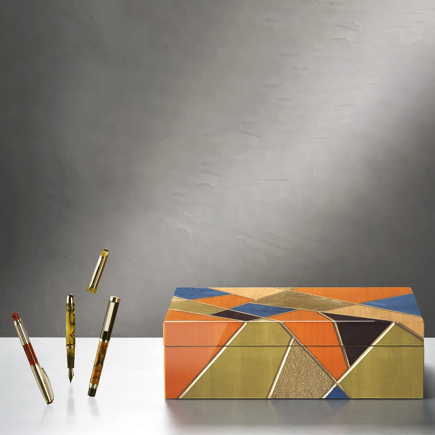 Parte della Collezione Tellux Sibilla, questo cofanetto è un pezzo pregiato realizzato a mano dove raccogliere penne preziose all’interno di un morbido nido foderato in Alcantara. Intarsi di palissandro, bolivar, frassino ed ebano arricchiti da vibranti tonalità contrastanti conferiscono all’esterno un’allure glamour e dinamica, accentuata da una rete di profili dorati. Una versione più piccola è disponibile nel catalogo Artemest.
