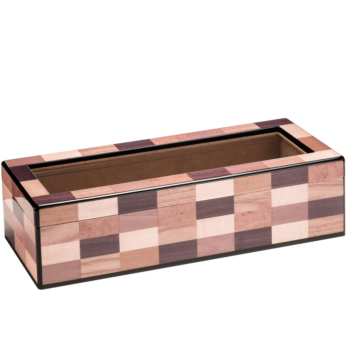 Una magistrale dimostrazione di maestria artigianale, questo squisito orologio sarà il regalo perfetto per gli appassionati di orologi e design. Il suo interno, rivestito in alcantara beige e arricchito da un elegante specchio posto sulla parte superiore, può contenere fino a sei orologi. Con una silhouette rettangolare arricchita da eleganti dettagli in metallo con finitura oro rosa, è realizzato in mogano impiallacciato con un intarsio geometrico in una delicata palette di colori pastello.