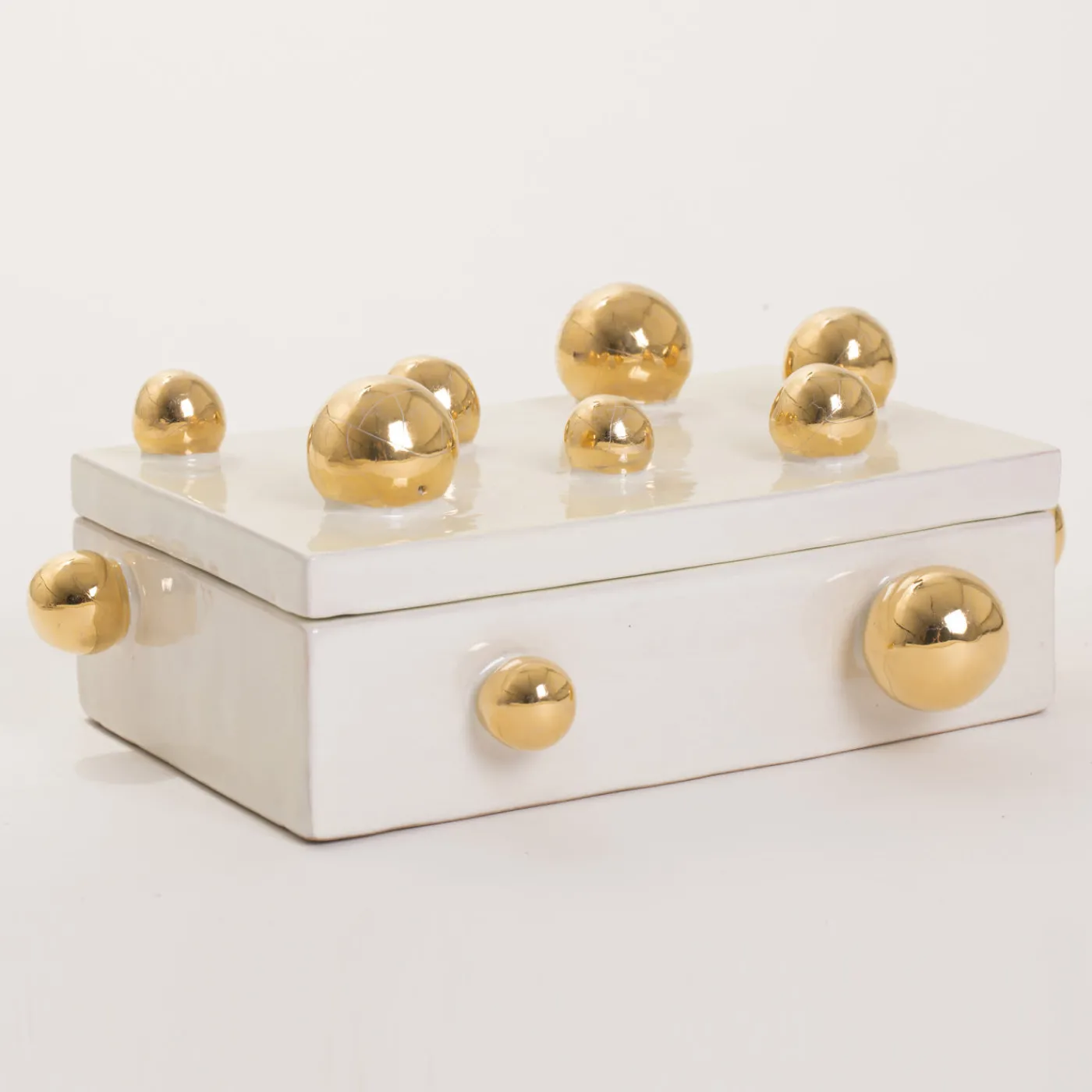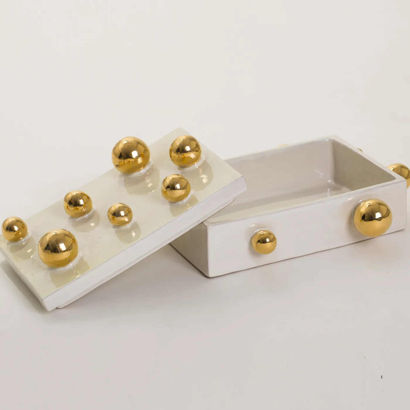 Questo bellissimo pezzo in maiolica è stato realizzato a mano con passione, tecniche tradizionali e ispirazione dai maestri ceramisti dell’atelier toscano ND Dolfi. La scatola è caratterizzata da una superficie smaltata bianca e pura, ornata da sfere d’oro sporgenti che creano un’estetica unica.