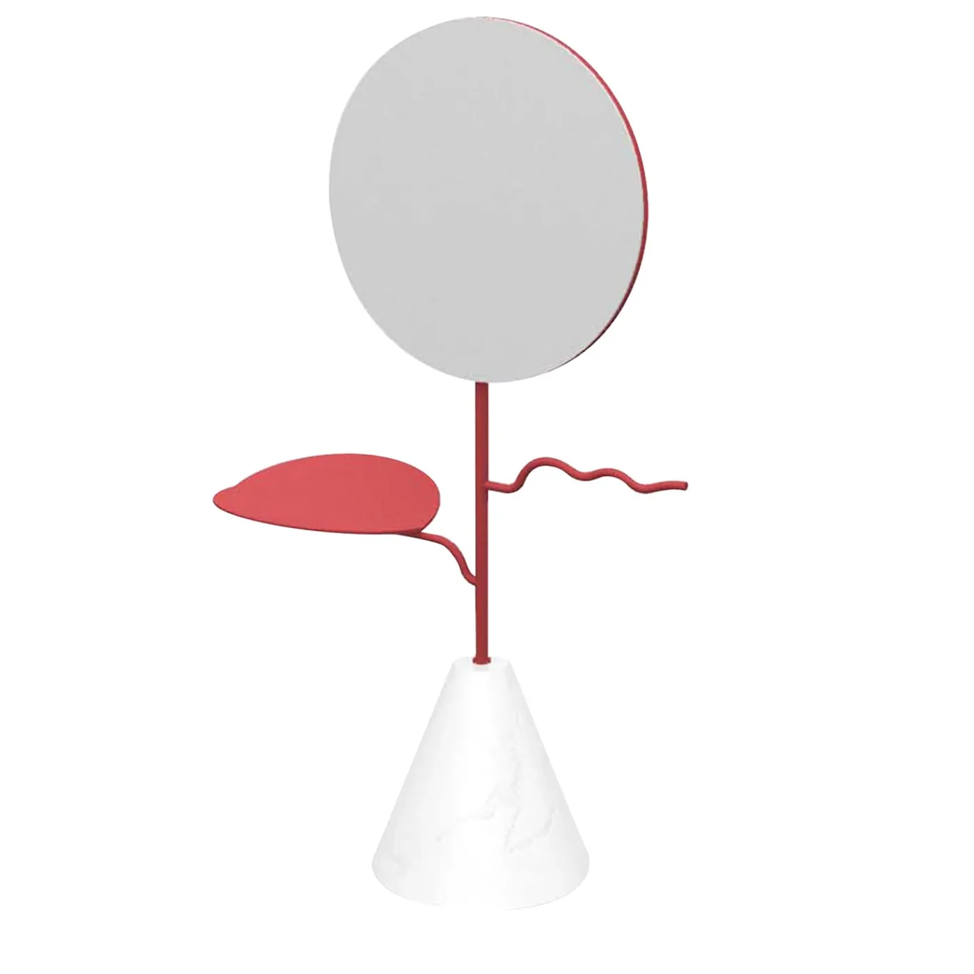 Una sofisticata silhouette fitomorfa ispirata alle piante di loto in un’elegante palette definisce questo portagioie con specchio incorporato, complemento perfetto per un bagno o una camera da letto contemporanei. Proposto in un’elegante combinazione di marmo bianco di Carrara per la base conica e ferro laccato rosa, quest’ultimo si ramifica in un ripiano a forma di foglia e in un braccio sinuoso per raccogliere i gioielli senza grovigli. Sono disponibili diverse tonalità e marmi, consultare il Concierge per le opzioni.