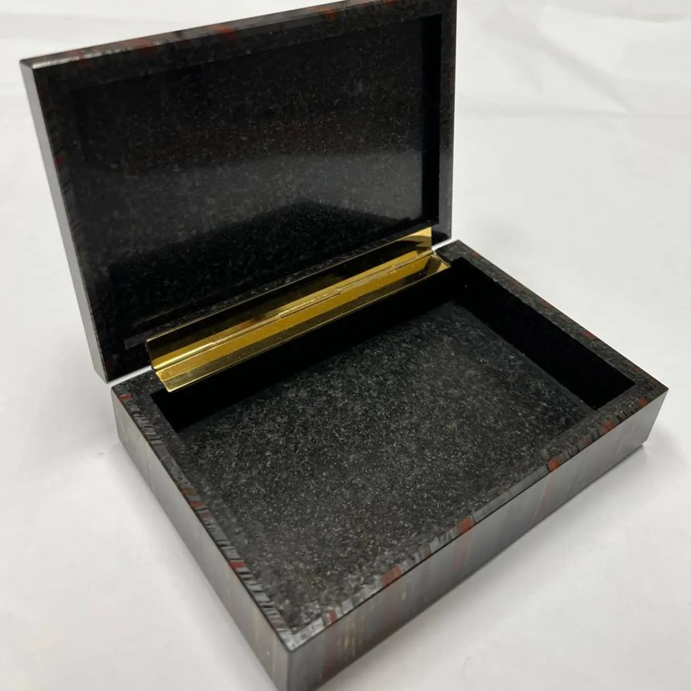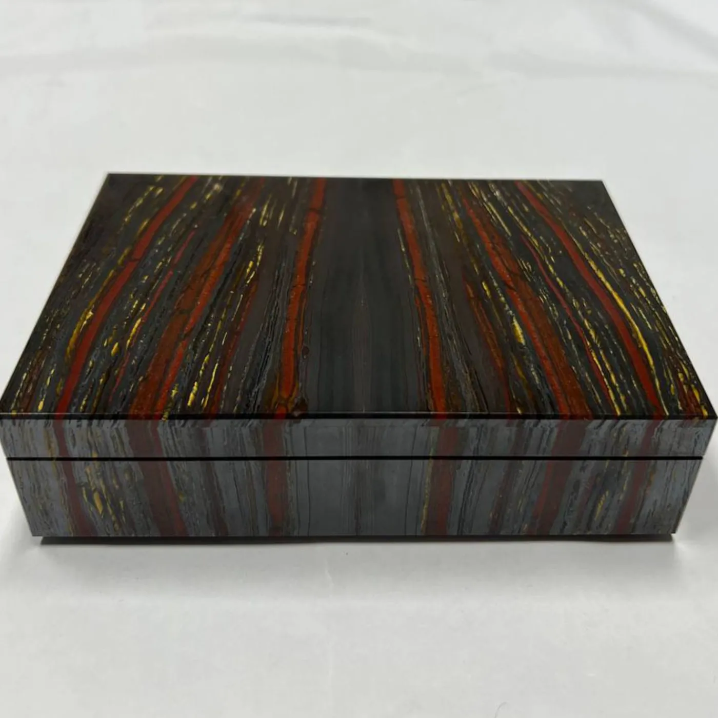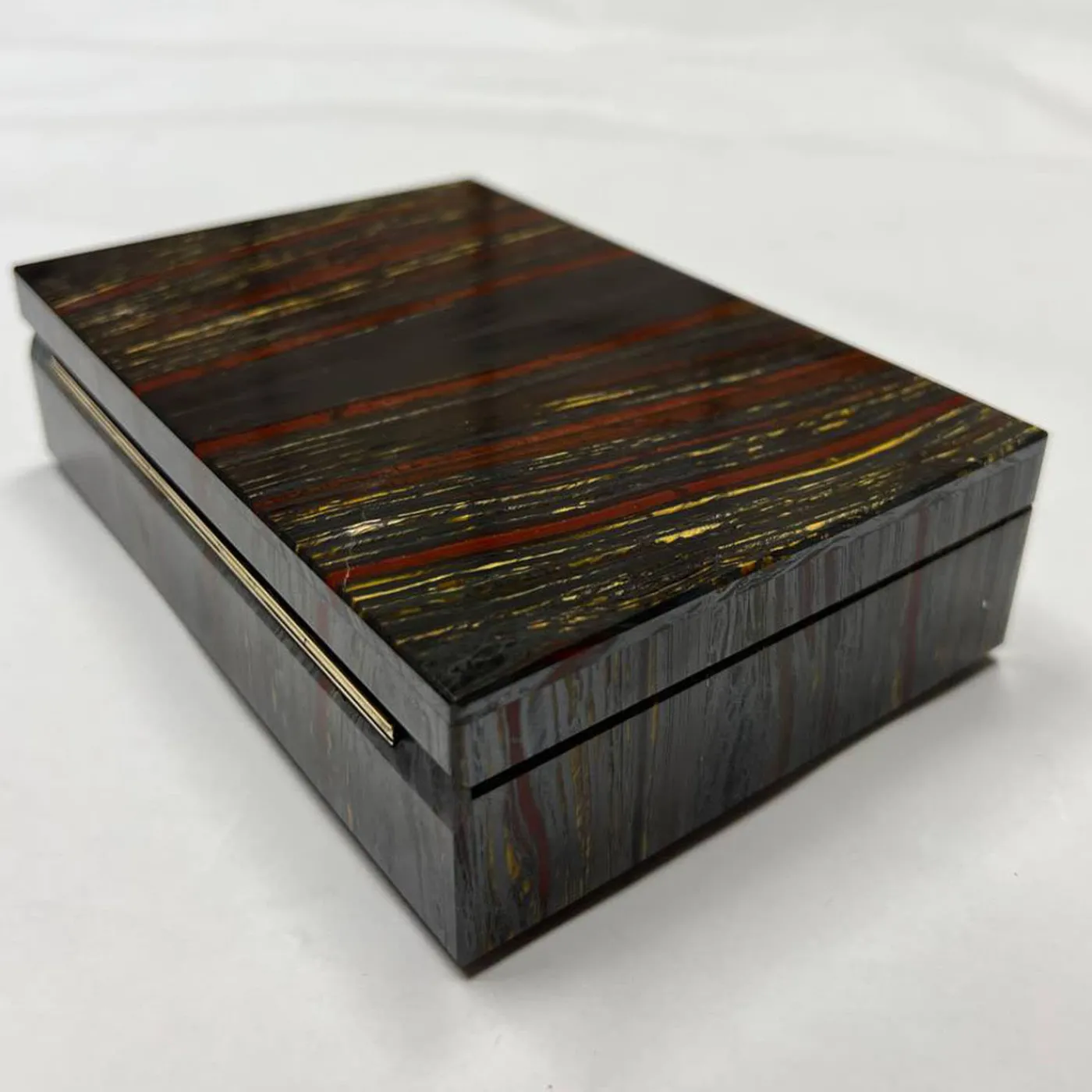 Il ferro tigrato fine è la pietra preziosa con cui è stato realizzato questo cofanetto dalle linee pulite, i cui tracciati imprevedibili e le venature dai toni caldi che vanno dall’oro al mogano garantiscono l’unicità di ogni singolo pezzo. Ideale per raccogliere i gioielli su un raffinato vanity desk o in bagno, va custodito grazie alla sua struttura opulenta.