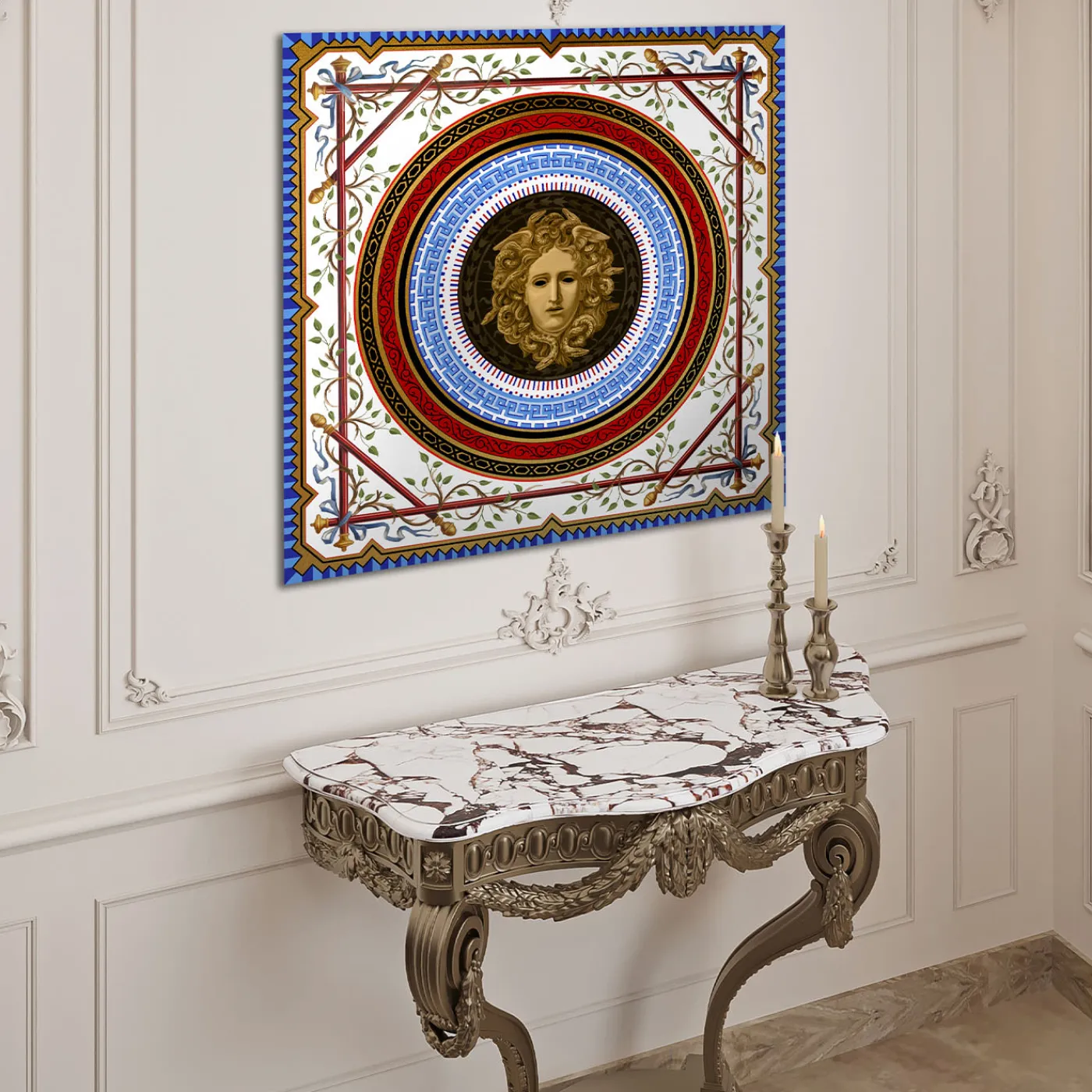 Questo pannello, che rappresenta in modo ipnotico Medusa, fonde mitologia e raffinata maestria. Gli intricati dettagli del volto sono arricchiti da polvere d’oro applicata a mano, che conferisce un bagliore etereo. Una tecnica a rilievo aggiunge profondità, rendendo la figura quasi realistica. La finitura lucida esalta il contrasto drammatico, rendendo quest’opera d’arte un pezzo forte e senza tempo per qualsiasi interno.