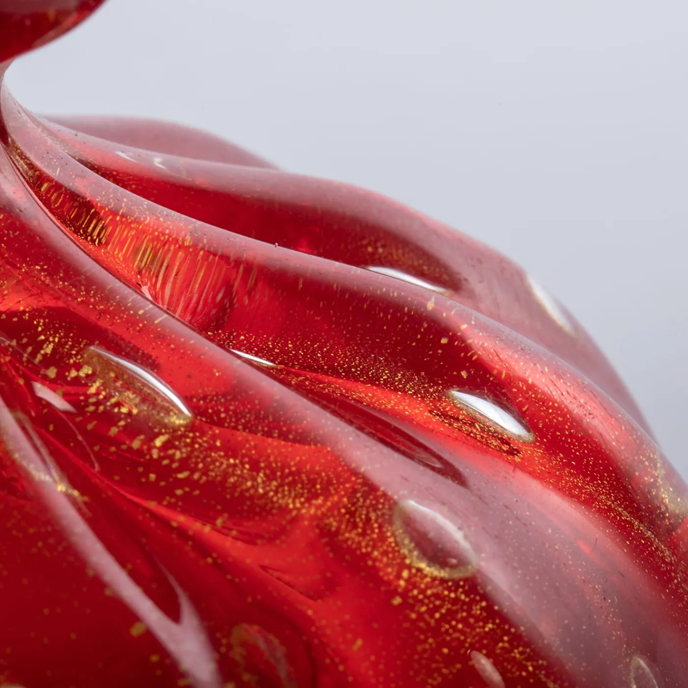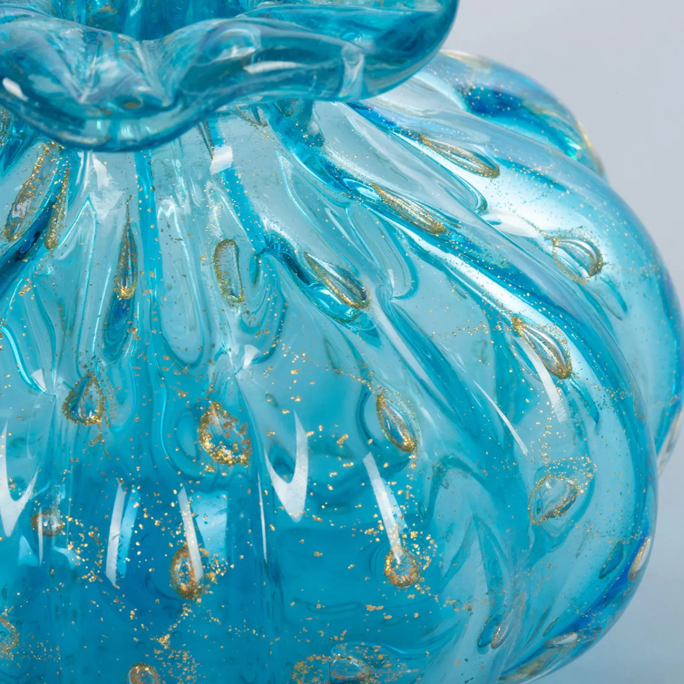 La caratteristica poetica che accomuna i tre piccoli vasi che compongono questo set è la presenza di bolle d’aria intrappolate all’interno del vetro accoppiate a granelli d’oro 24 carati. Il loro design a balze è stato ottenuto seguendo la tradizionale tecnica del balloton, tipica dei capolavori soffiati a bocca di Murano fin dall’antichità. Proposti in versione ambra scura, rossa e azzurra, possono essere utilizzati anche come contenitore di profumi per la casa da diffondere con le canne.