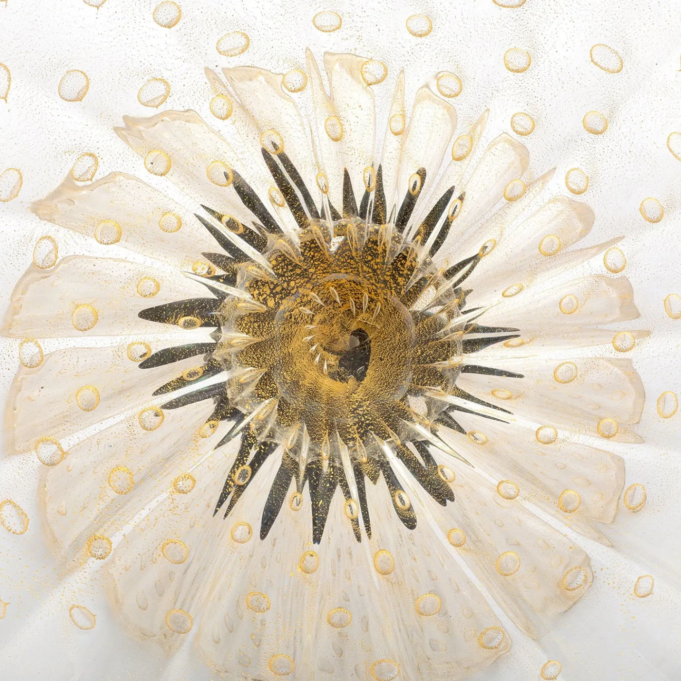 Soffiata a bocca con cura da un rinomato maestro vetraio di Murano, questa coppa di cristallo con piede è un’aggiunta superba e lussuosa a un arredamento classico o moderno. Un elemento nero circondato da petali sembra ornare il centro, in contrasto con il resto del cristallo dorato arricchito da bolle d’aria e da puntini d’oro 24 carati. Il certificato di autenticità è incluso nell’acquisto.