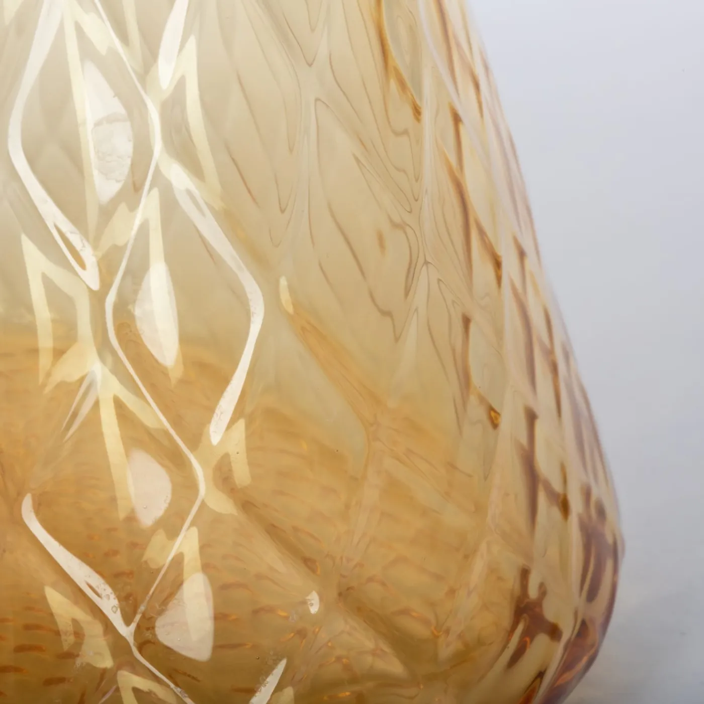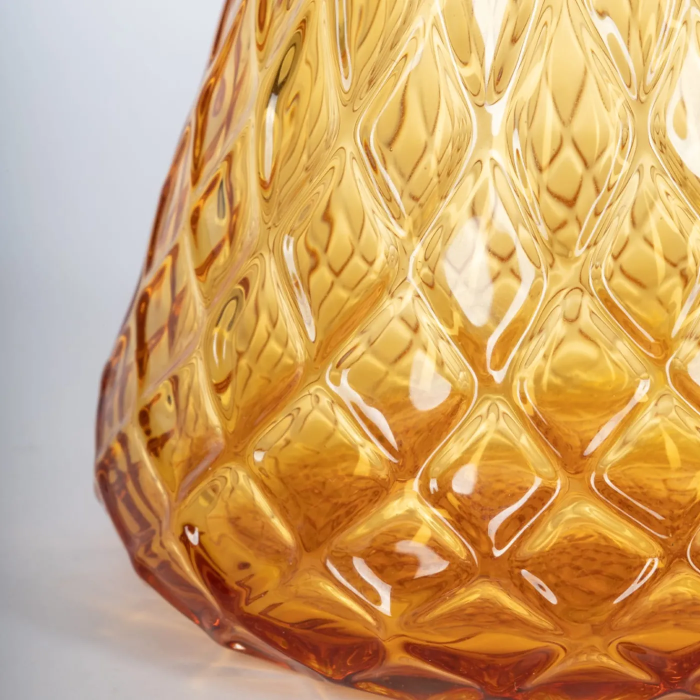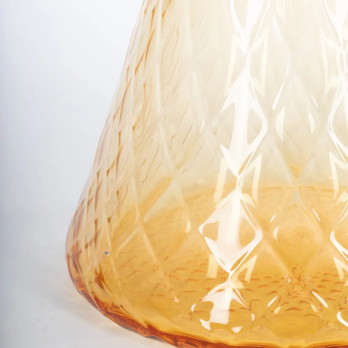 Prezioso complemento per le case moderne, questo set di due vasi conici abbina una geometria pulita alla preziosità del vetro soffiato a bocca. Una texture a diamante – frutto di un’abile applicazione della tecnica del balloton – caratterizza i loro corpi, segnati da sfumature ambrate e sigillati da sottili bordi in vetro verde. Misurano rispettivamente 20 e 14 cm di altezza e 24 e 10 cm di diametro.