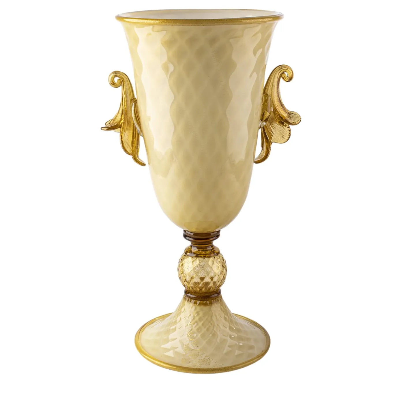 Una sapiente combinazione di ricchi dettagli accresce il carattere opulento di questo vaso a forma di calice, abilmente soffiato a bocca dai maestri muranesi. Il vetro trasparente color ambra caratterizza gli elementi floreali che accentuano i lati e l’elemento sferico che collega la base svasata alla coppa, dove i fiori troveranno una casa davvero lussuosa. Inserti in foglia d’oro 24 K adornano il pezzo, creando incantevoli bagliori.