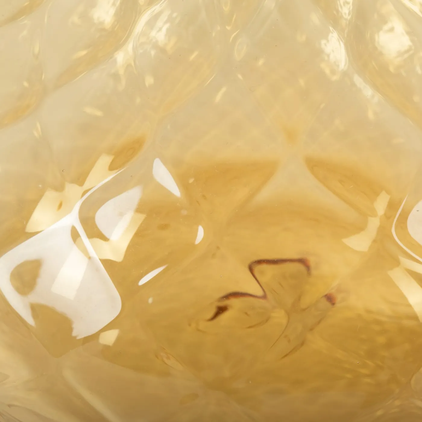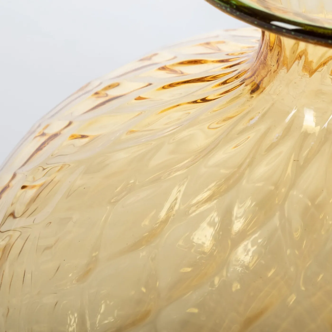 Soluzione minuscola per esporre fiori di campo o contenere un’inebriante fragranza domestica da diffondere attraverso le canne, questo elegante vaso in vetro ambrato esemplifica l’abilità dei soffiatori muranesi. L’ampia e accattivante texture a diamante è il risultato della tecnica del balloton, che conferisce al corpo sferico un carattere visivo e materico. Il bordo del vetro è in una vibrante tonalità di verde, che aggiunge un delizioso contrasto che completa il pezzo.